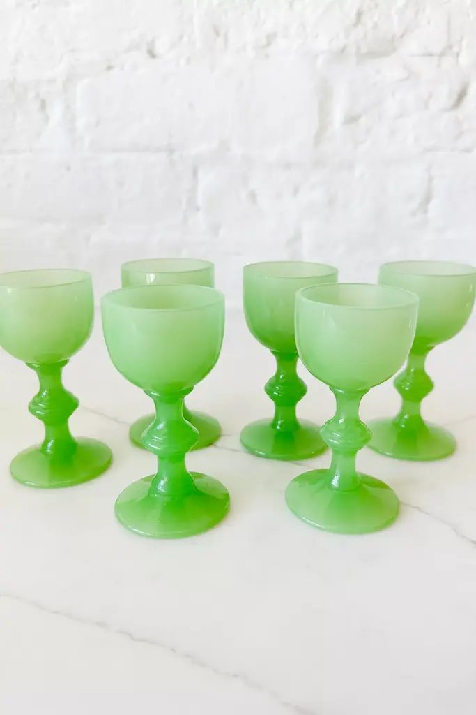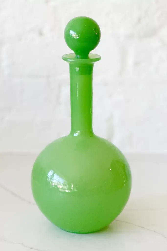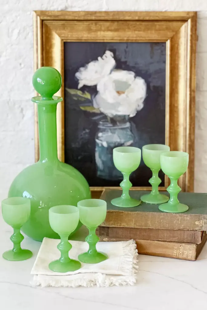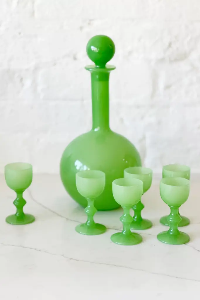 **Please note all sales are final**Pour in style! You could serve Capri Suns from this lovely lady and your guests would be impressed. Whatever you select to fill this incredible decanter with, know that it will serve you well. This incredibly rare Portieux Vallerysthal decanter set makes a bold statement that is well deserved. We'll drink to that!About Old Flame Candle Co. for Anthropologie: VINTAGE VESSELS. MODERN SCENTS. NATURAL WAX. Old Flame Candle Co. originated with hand-picked, uniquely vintage vessels that were transformed into chic candles for the design-savvy buyer. Old Flame has blossomed beyond just candles, yet remains true to our vintage roots.* Vintage 1940s Portieux Vallerysthal Rare Spring Green Decanter and Cordials, set of 6* Due to the authentic vintage nature of each carefully selected piece, they may be adorned with subtle markings, tarnish, patina, scratches, and/or verdigris, only lending to their character and beauty; no cracks or chips should ever be visible, unless noted in listing* Hand wash#### *Dimensions** Decanter: 11" tall (lidded) x 5" wide* Cordials: 3.25" tall x 2" wide