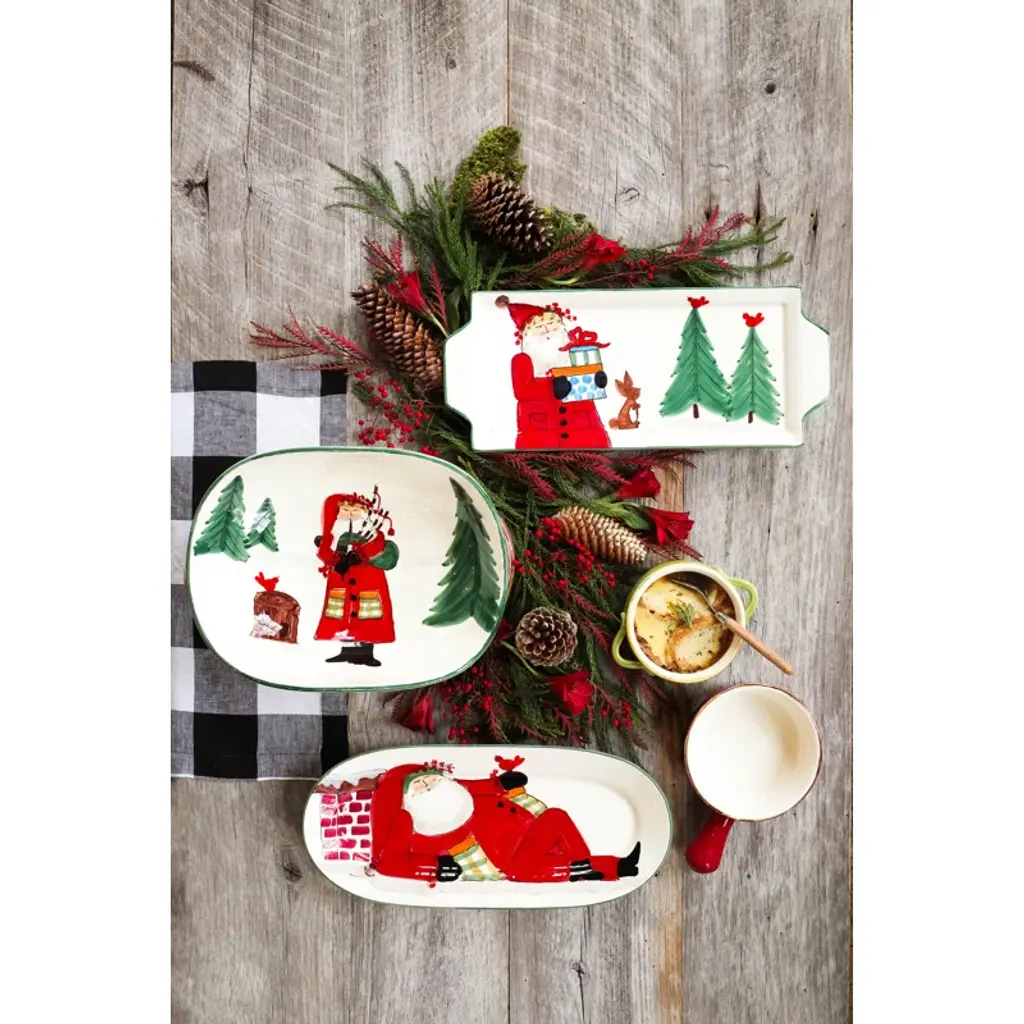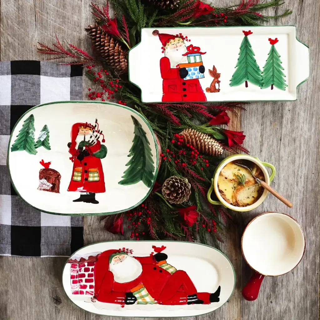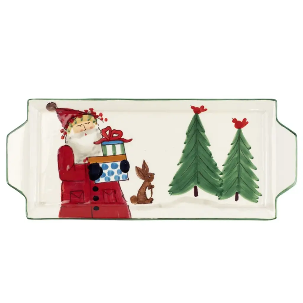 Inspired by childhood memories of Babbo Natale, Italy's Santa Claus, maestro artisans hand-paint the Old St. Nick Handled Rectangular Platter, providing us a glimpse into Old St. Nick's daily adventures leading up to preparations for each holiday season.