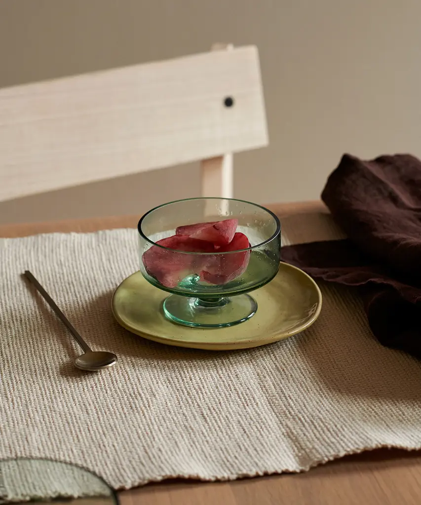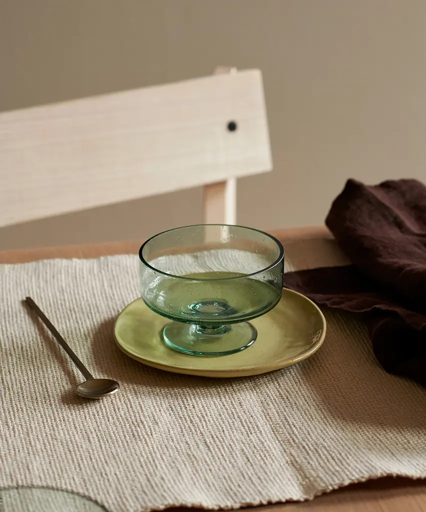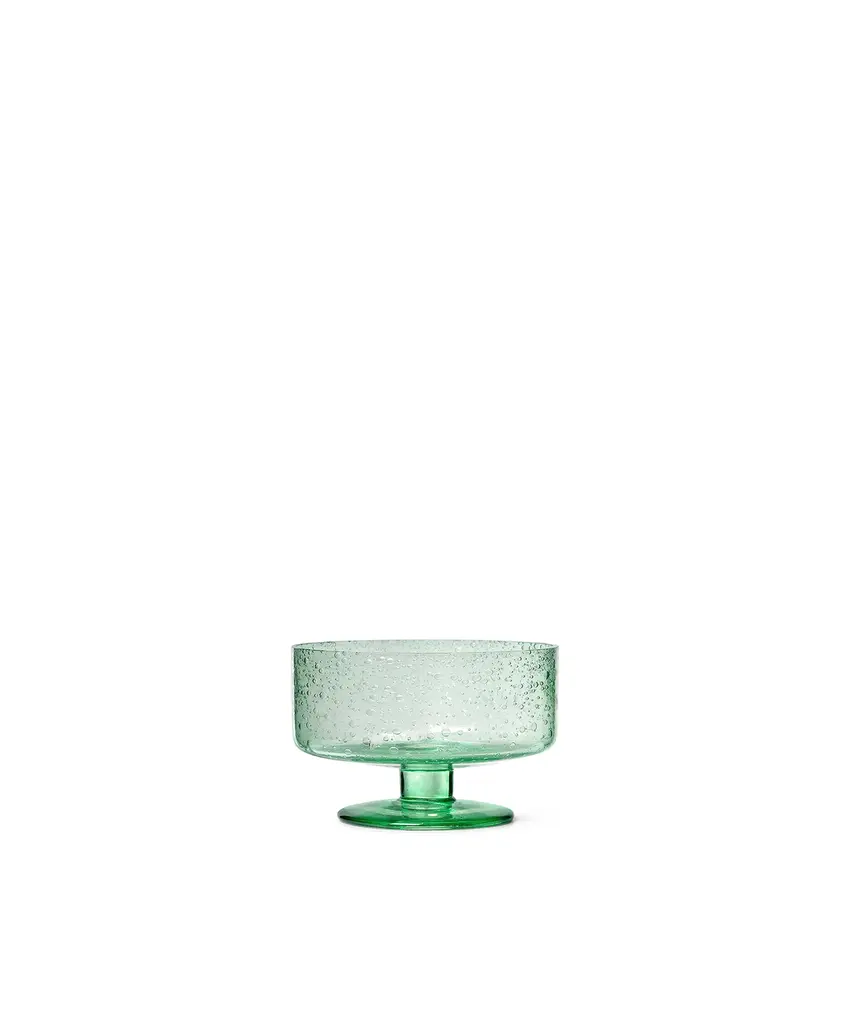 The versatile Oli glassware is designed for casual living and dining. Set the table for dinner with friends using the Oli Dessert Cups, made from 100% recycled glass with a characteristic, subtly colored tone. Adding to their tactility, the dessert cups have distinctive, tiny bubbles created by deliberate pockets of air left between the layers of mouth-blown glass. Each Oli Dessert Cup is unique in thickness and color, owing to the recycled material and the intricate process of blowing the melted glass into shape. Designed and produced by the Copenhagen-based studio Ferm Living.