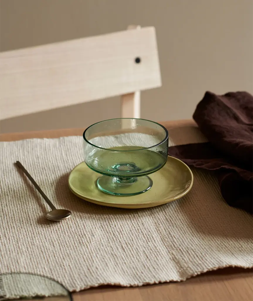 Effortlessly resting in your hand, the versatile Oli glassware collection is designed for everyday living. Made from 50% recycled glass, the glassware has distinctive, tiny bubbles created by deliberate pockets of air left between the layers of mouth-blown glass that add to their tactility. Each Oli Dessert Cup is unique in thickness and color, owing to the recycled material and the intricate process of blowing the melted glass into shape.