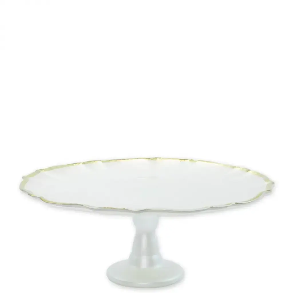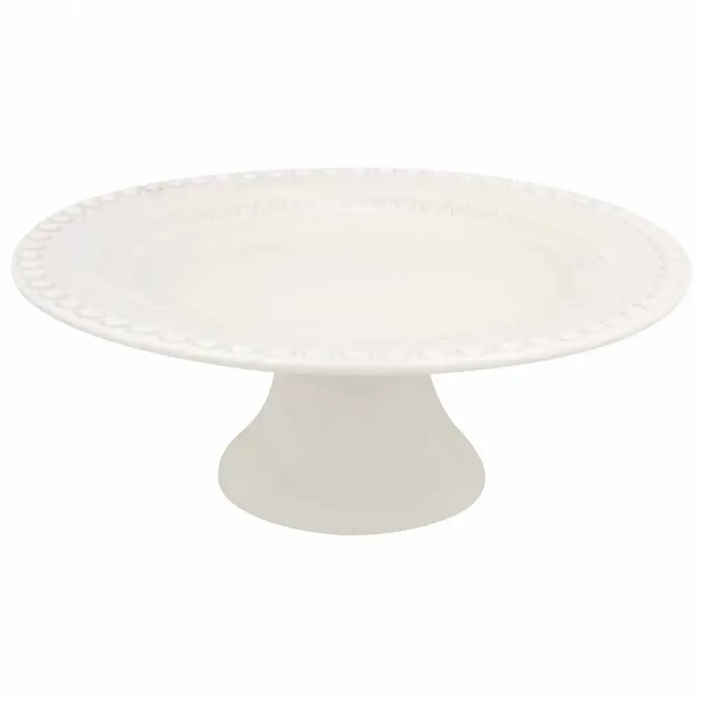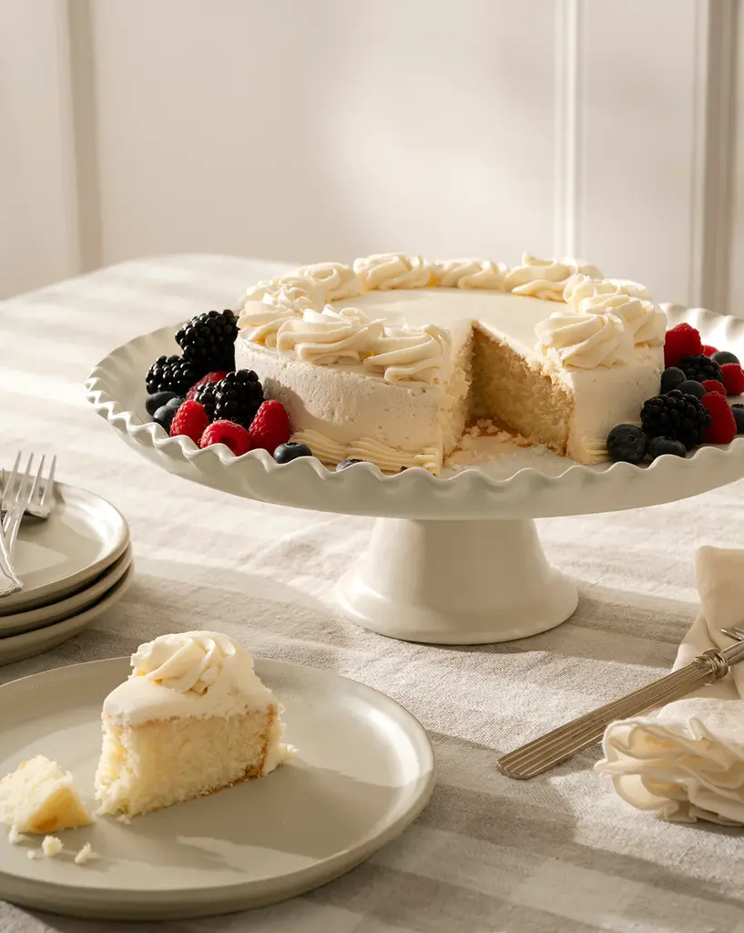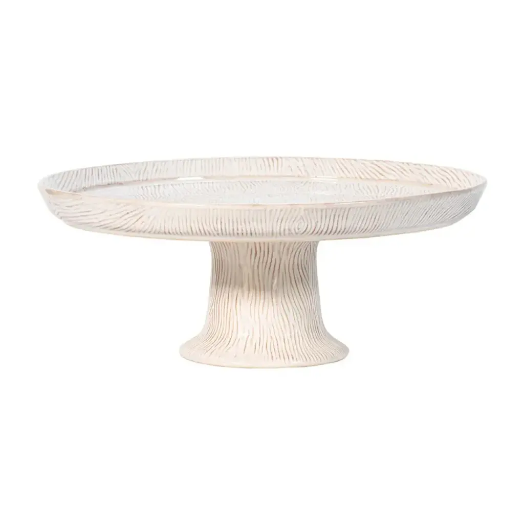 The Olindo Cake Stand brings a refined yet playful touch to the table with its scalloped edge and classic pedestal base. Crafted in a soft neutral glaze, it's an elegant way to present cakes, pastries, or seasonal displays with timeless charm.