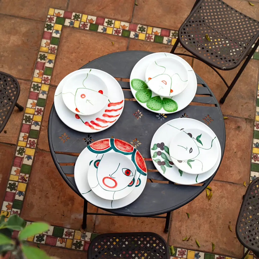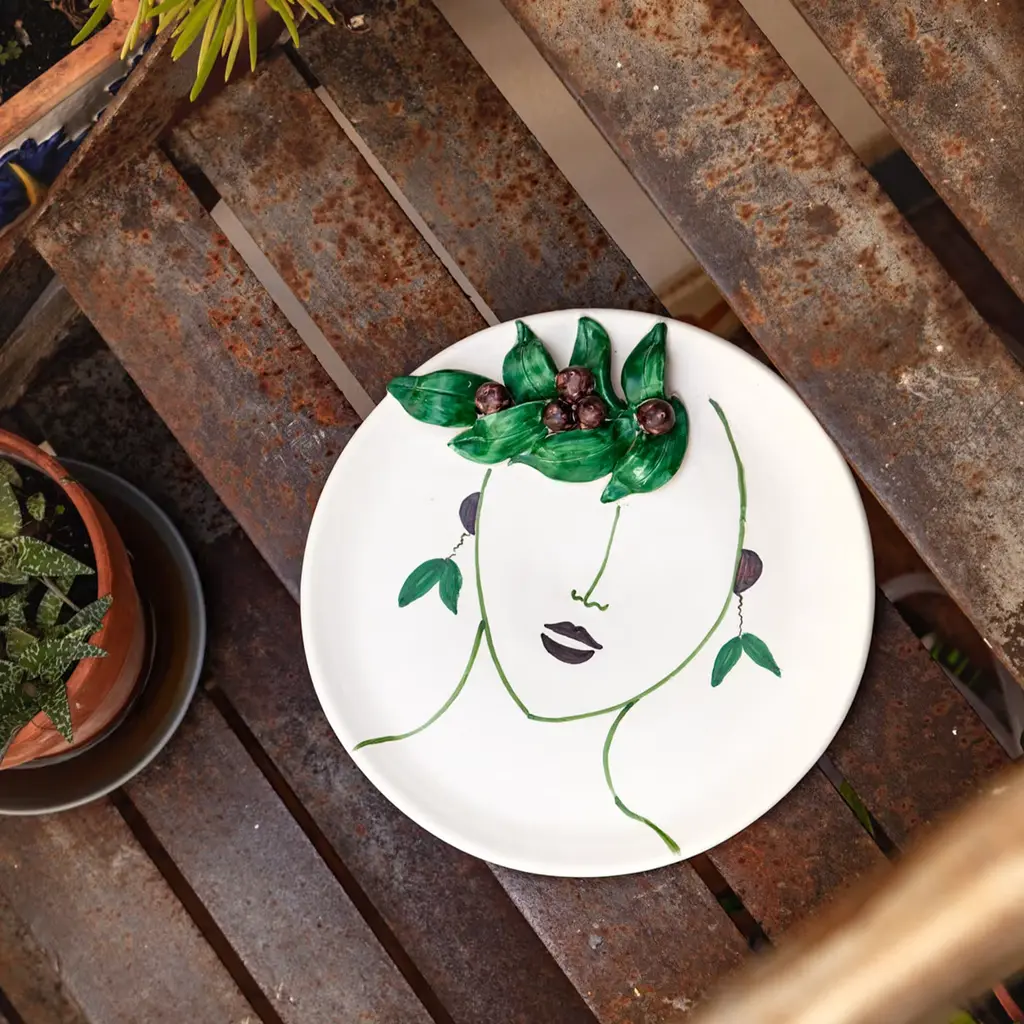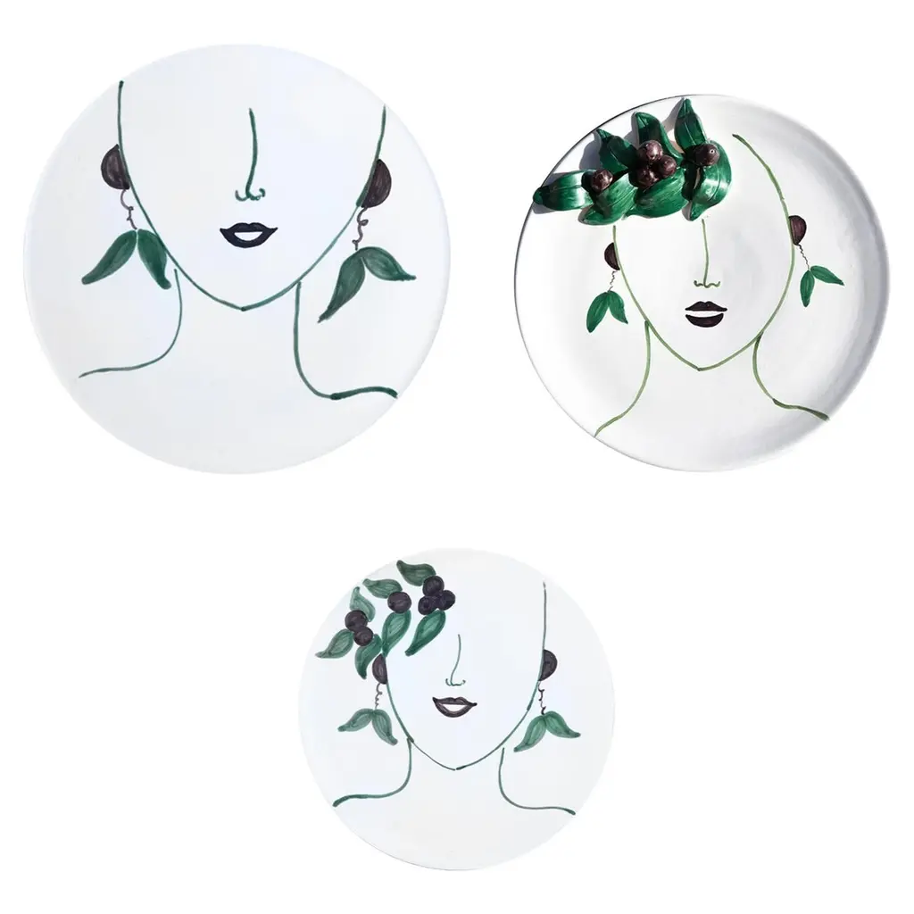 The bucolic flair imbuing this set in white-glazed ceramic is ennobled by the striking artistic sensibility of Patrizia Italiano, who deftly handcrafts and paints in green and black each of the three plates composing the set. A feminine stylized human profile graces the designs, adorned with lush decorations of olives and olives leaves, also in a 3D version for the plate measuring 30 cm in diameter. The set also comprises a soup plate (18 cm ⌀) and plate measuring 29 cm in diameter.