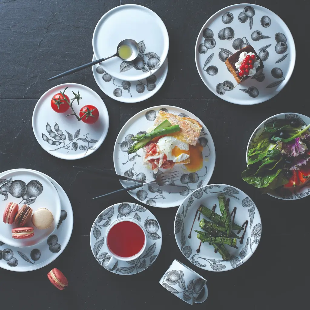 The use of pen-drawn imagery has been inspired by visits to local farmers' markets. With the purity of the black on a white color scheme, this platter is an ideal backdrop for serving vibrant, colorful food. The modern shapes of the collection add to the sophistication of your table setting. Modern monochrome from the Olive Market collection by Twig New York.Ideal for cereal and soupOne bowl per boxOlive Market Collection