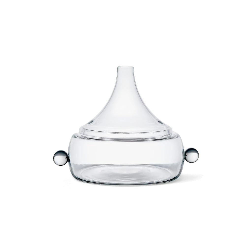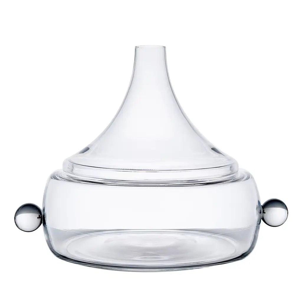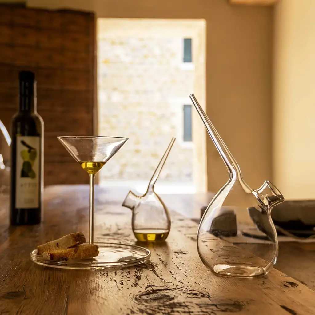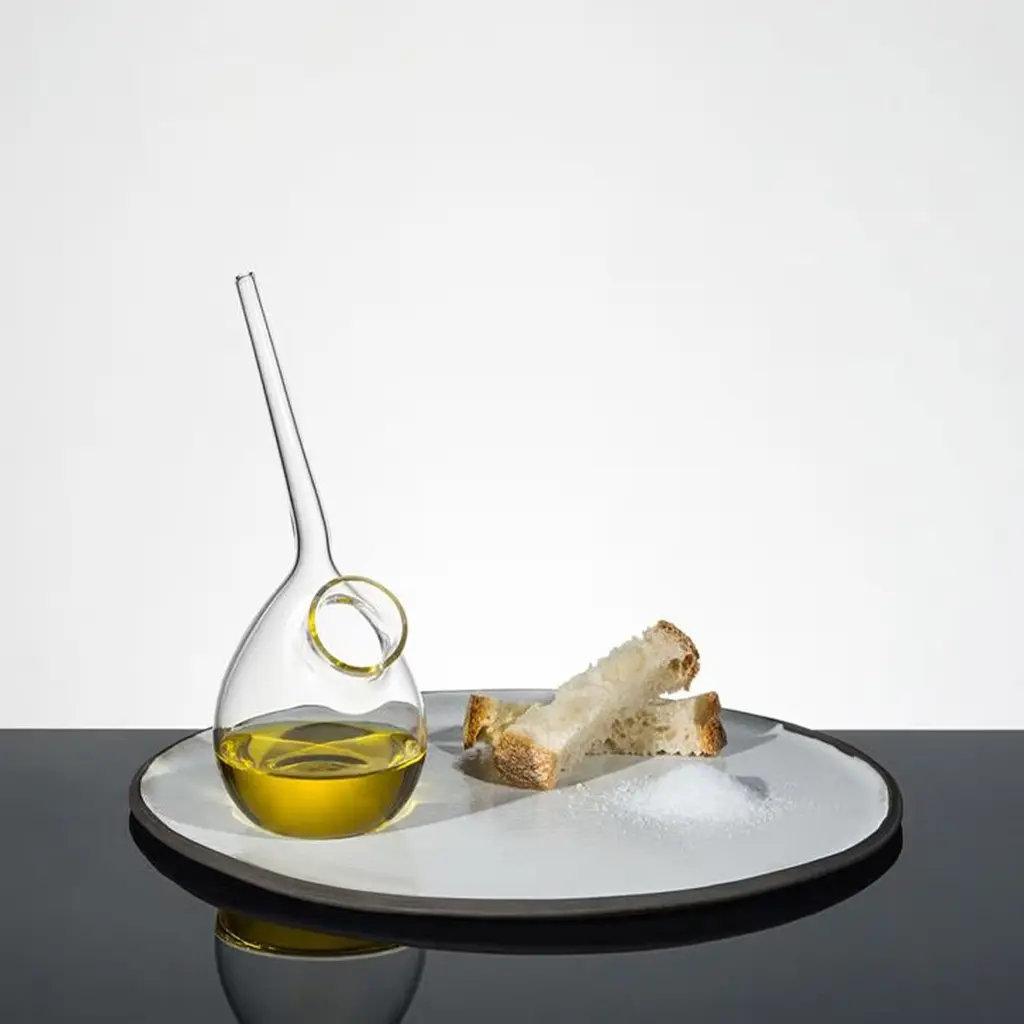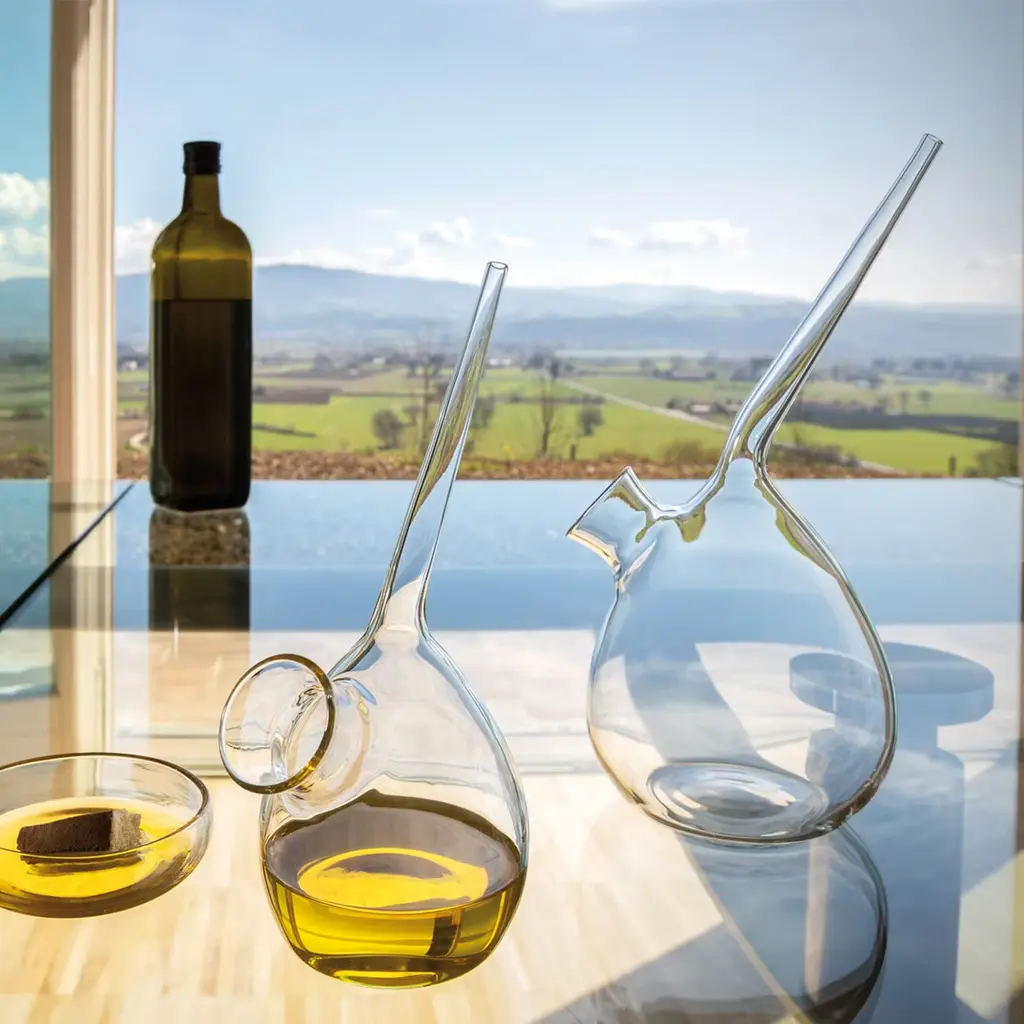 A lively accent piece for a refined interior of contemporary inspiration, this splendid design by Simone Micheli is a sleek and minimalist oil jar handcrafted of borosilicate glass. Highly functional while extremely sophisticated in aesthetic, it features a slim and tapered neck lending it additional refinement. Available in two different sizes, please ask the Concierge for details.
