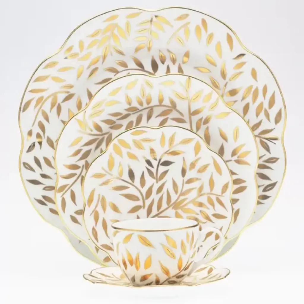 Gold olive leaves and mat gold filets add a Mediterranean elegance to the Olivier Dinnerware collection. Five-piece place setting includes dinner plate, dessert plate, bread/butter plate, teacup, and saucer. As the oldest porcelain factory in the French city of Limoges, Royal Limoges boasts a long history of creating hand crafted dinnerware from its own kaolin clay. Since 1797, its exclusive patterns have been enjoyed by clients worldwide.