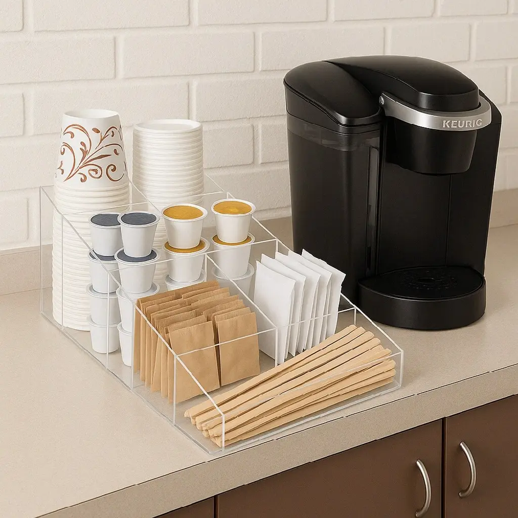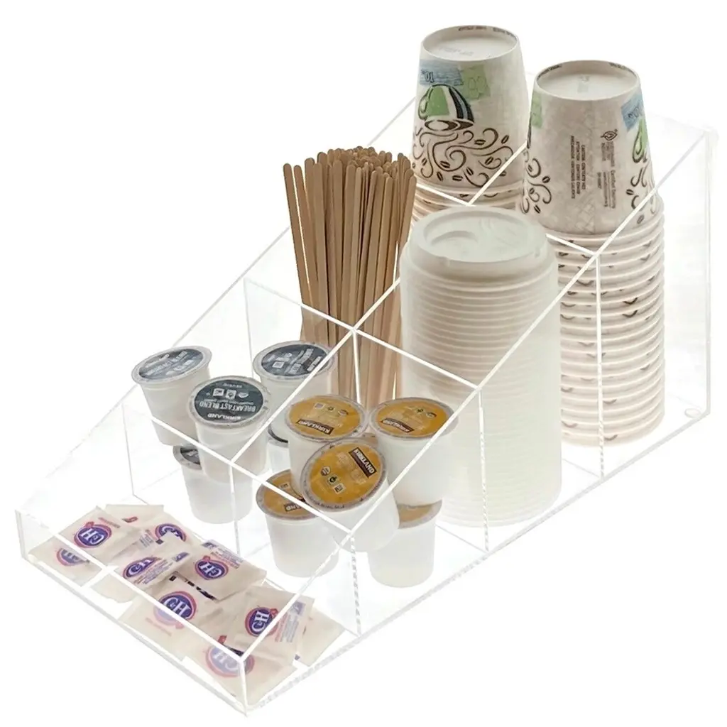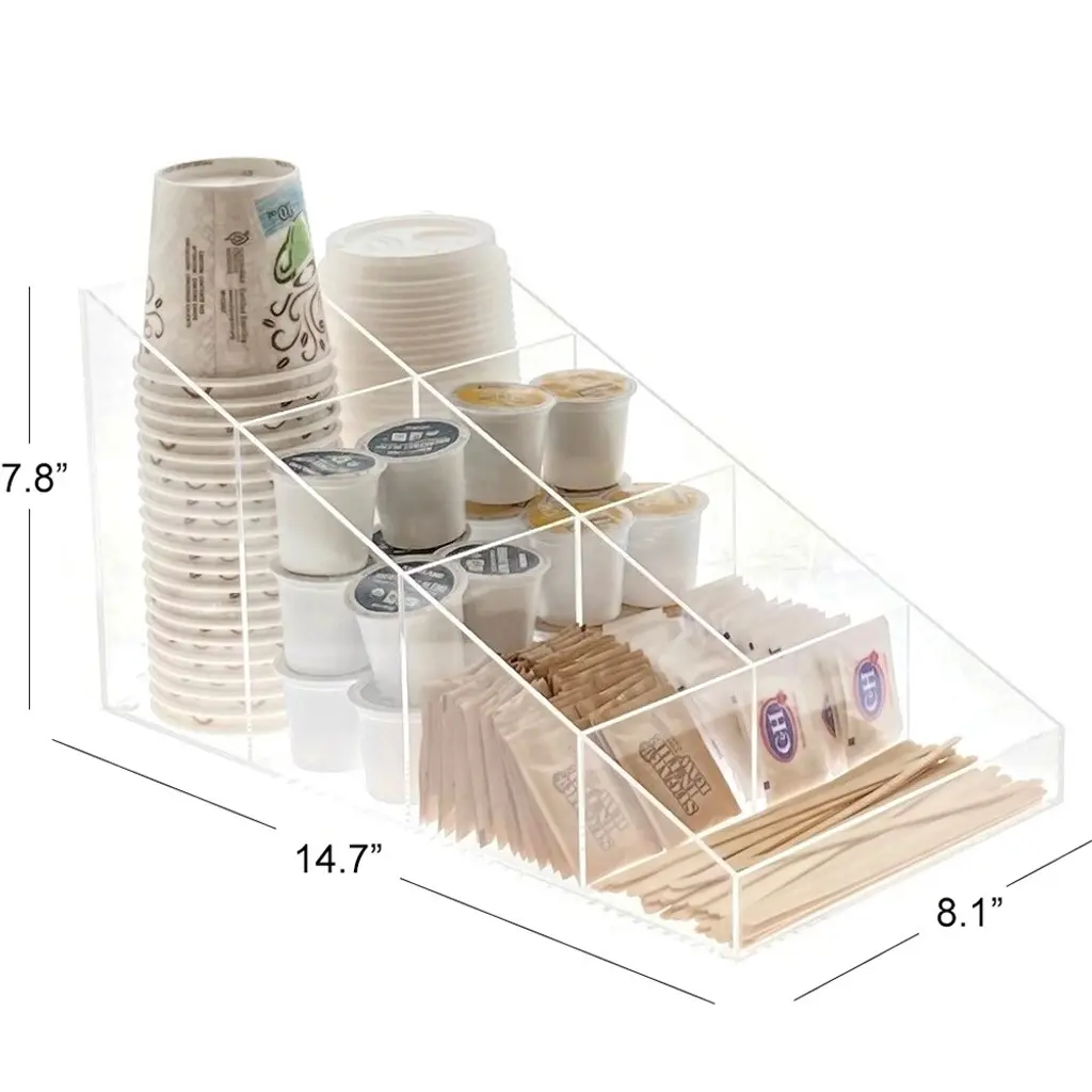 New from OnDisplay is our exclusive Java Joe Acrylic Coffee Breakroom Station series. Constructed of handmade acrylic, our coffee breakroom station is perfect for your home or office breakroom. This amazing design stores all your hot and cold cups, lids, coffee pods, sugar, tea, stir sticks, and more in 7 varying height sections. The Java Joe Coffee Station measures 14.7" deep x 8.1" wide and 7.8" tall. Easy to clean.