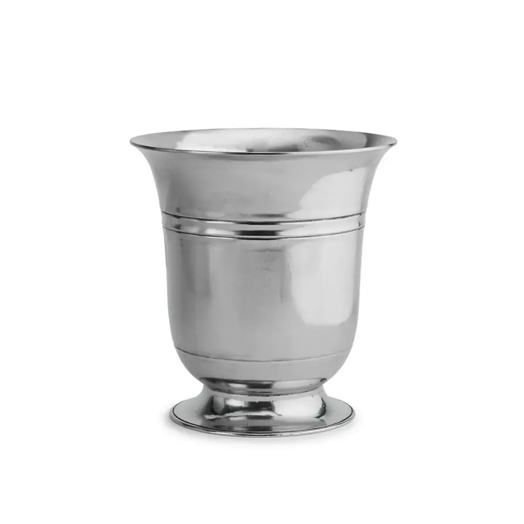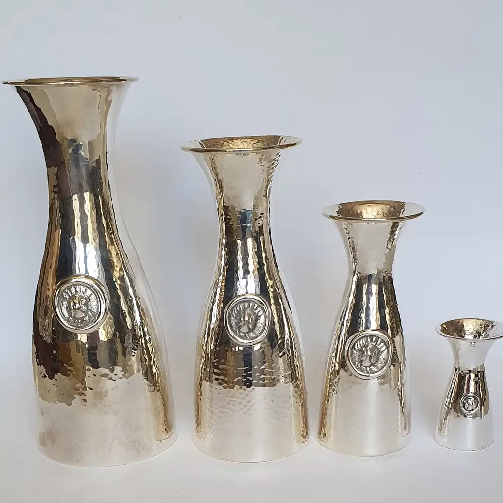 This elegant interpretation of an iconic dinner table object is made entirely in solid silver. The classic one-liter bottle, that is a staple of old-fashioned trattorie throughout Italy, is given a sophisticated upgrade. The surface of the silver was lightly hammered to give it a gently wrinkled texture, while the center is engraved with the emblem that traditionally mentions the quantity of liquid contained. Playful and classic, this piece will enrich any decor.