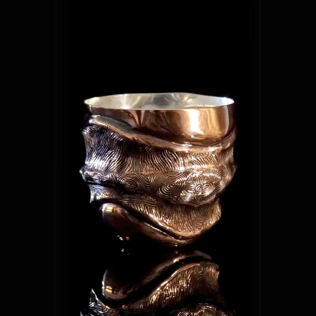 Experience the perfect harmony of artistry and craftsmanship with this Luxury Handcrafted Copper Cup, featuring an organically sculpted design that embodies elegance and modernity. Its textured, layered surface creates a striking visual impact, while the 999 sterling silver interior adds a refined touch of opulence. Crafted from 1.2mm thick copper, this cup not only offers durability but also serves as a testament to the artisan's skill in transforming raw materials into a piece of functional art.