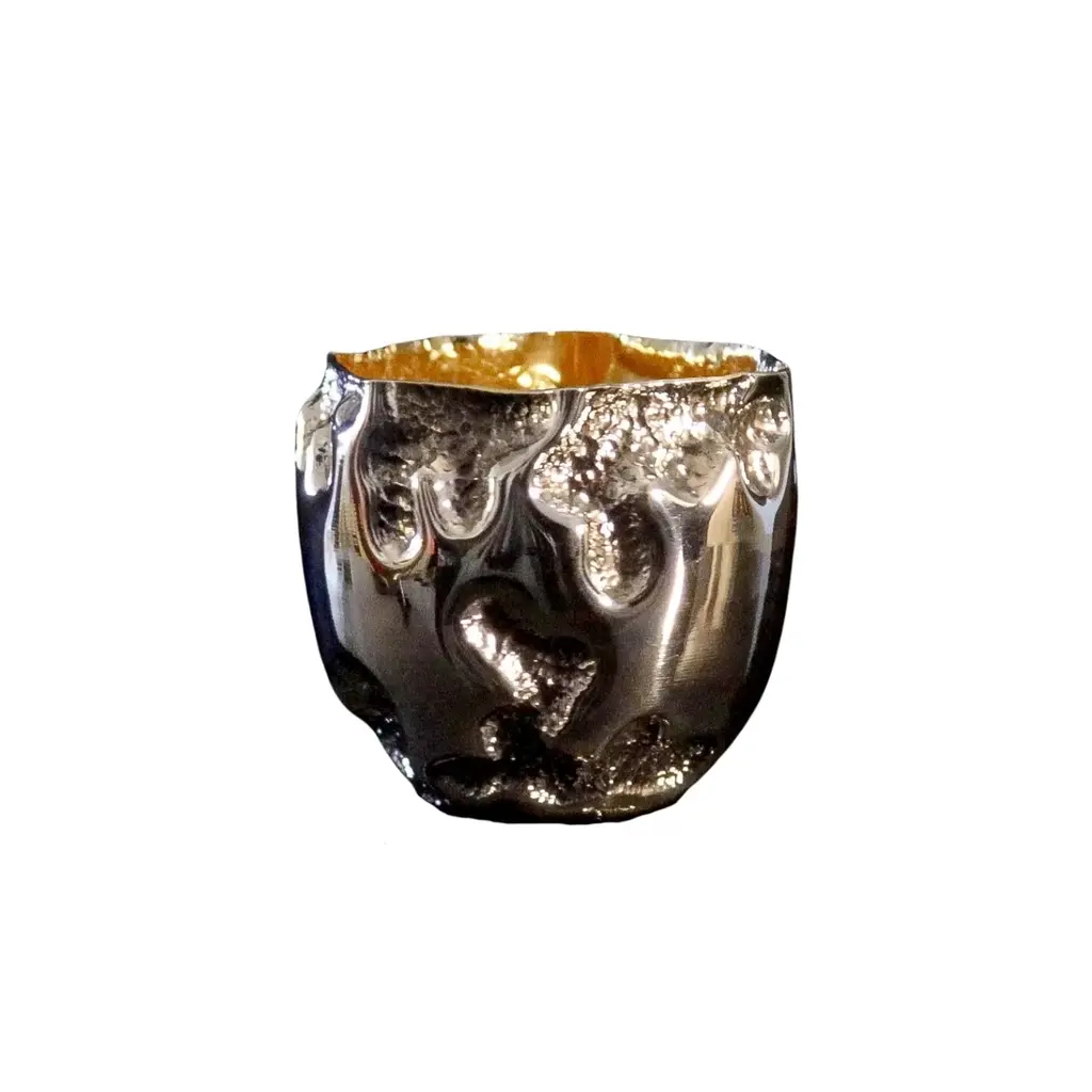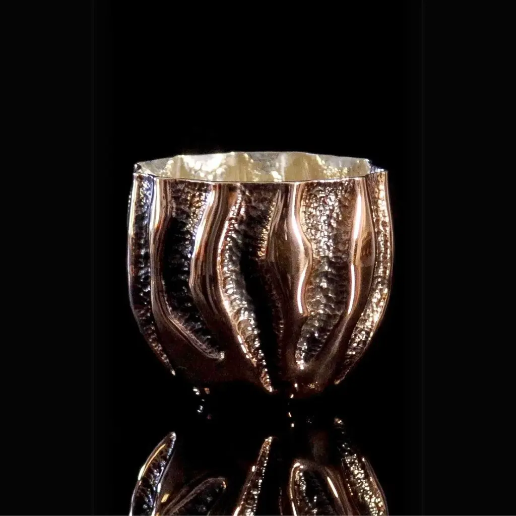 Elevate your drinkware collection with this Handcrafted Copper Drinking Cup, a true work of art that seamlessly blends form and function. The unique sculptural design features flowing, organic lines that evoke a sense of movement, making it both a functional piece and a statement of modern craftsmanship. Handcrafted from 1.2mm thick copper and coated with 999 sterling silver, this luxurious cup offers a polished, gleaming interior that contrasts beautifully with its textured copper exterior.