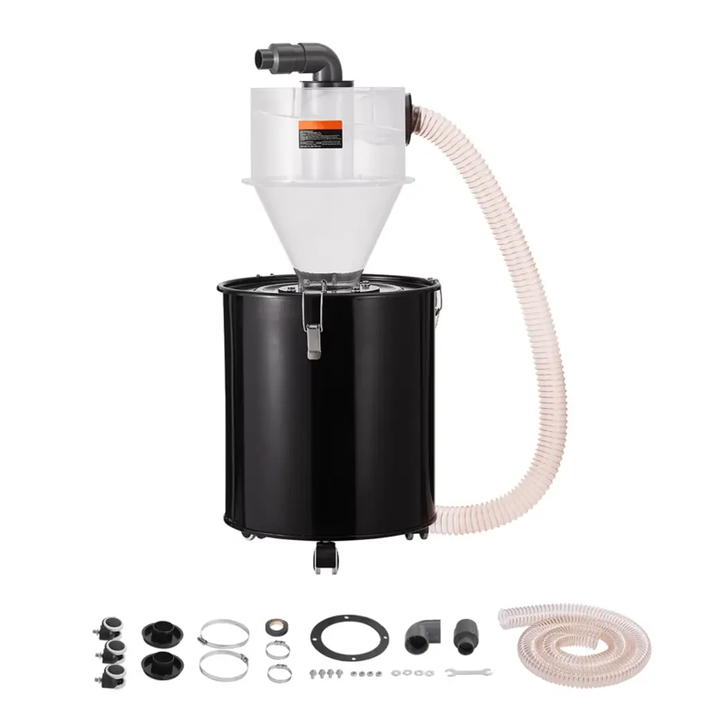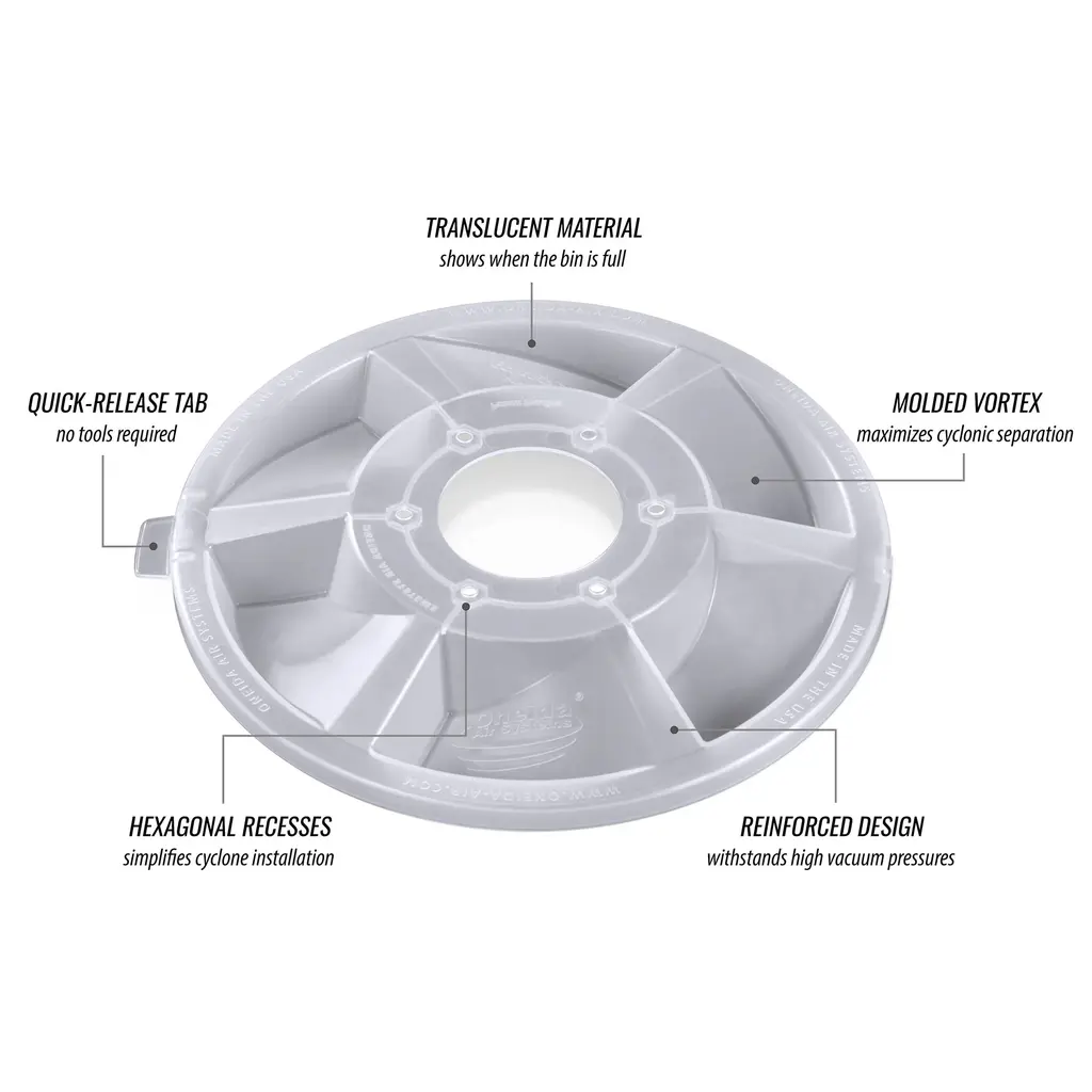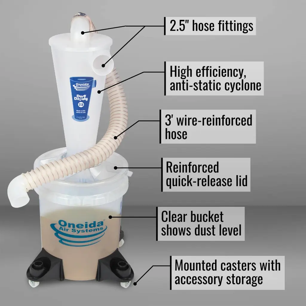 Keep your woodworking space tidy with the Oneida Air Systems Dust Deputy 2.5 Deluxe All-Clear Cyclone Separator. Optimized for more powerful wet/dry vacuums, this larger cyclone delivers up to double the airflow of smaller cyclones and lid-style separators. Using centrifugal force to separate and remove 99 percent of dust and debris from the airstream before it reaches your vacuum's filter, this attachment eliminates clogged filters and suction loss. The Dust Deputy will save you the significant time that it takes to replace filters and dust bags while keeping your wet/dry vac operating at peak performance. This simple and efficient design can be adapted for use with any make, size, or model vacuum and features female inlet and outlet ports that fit the cuffed 2.5-inch hoses of larger shop vacuums (vacuum not included). For woodworkers and other makers in need of an effective and affordable dust control solution, the Dust Deputy 2.5 Deluxe All Clear Cyclone Separator Kit from Oneida Air Systems will get the job done. Cyclone separator kit uses centrifugal force to capture and remove 99 percent of dust and debris from the air stream before it reaches your vacuum's filter; Eliminates clogged filters and suction loss Includes separator, 5-gallon bucket, lid, 4 caster wheels, 4.5-foot vacuum hose with swivel cuffs for easy attachment, on-board accessory storage, vacuum connection tether kit, and pre-cut neoprene foam gasket Works with nearly any type of material including drywall/wood dust, baking flour, grass, pet hair, soot, blasting soda, metal shavings, and more; Great for use in construction, at home, and everywhere else Prolongs the life of filters and helps avoid suction loss while reducing the need for cleanings and replacement; Saves significant time and money on replacement filters and dust bags Upgrades any make, size, or model of shop vacuum with 2.5-inch hose fittings; Backwards compatible 3-inch ID flange makes upgrades quick and easy Collapse-proof, heavy-duty 5-gallon bucket features a compact and stable footprint with 4-free rotating casters for easy portability Reinforced quick-release, cyclone lid for fast and easy emptying so clean-up is a breeze Clear components allow you to easily spot potential blockages and give you a real-time view of dust separation Anti-static components significantly reduce the likelihood of static shocks Neutral-vane technology improves separation efficiency by 20 percent Nominal inlet size: 2.25 inches I.D. / 2.5 inches O.D. Actual inlet size: Tapered 2.31 inches to 2.29 inches I.D. Nominal outlet size: 2.25 inches I.D. Actual outlet size: Tapered 2.31 inches to 2.29 inches I.D. Discharge size: 3 inches I.D. Height to center of inlet: 30.25 inches Material: Polypropylene Color: Clear Dimensions (L x W x H): 17.75 x 13.5 x 32.13 inches Weight: 9 pounds Manufacturer warranty: 1-year warranty