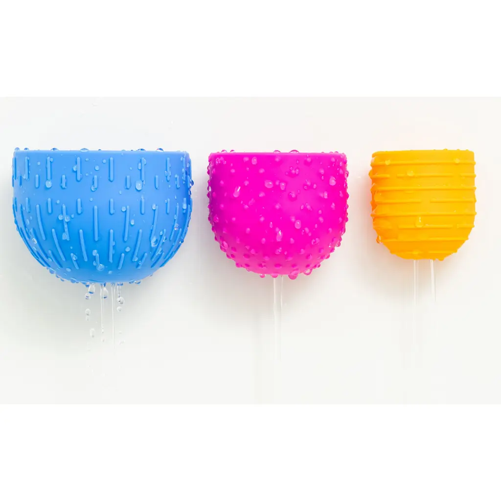 These fun, bright, textured and STICKY cups provide endless tub time play while helping your child build a variety of skills! OOMPLZ allow your little ones to explore: Water transference. Suction tendencies. A variety of sprinkle effects. Water's relation to gravity. When bathtime is done, just stack and store! Bathtime bliss for kids and easy peasy storage for adults! Encourage and support: Cause and Effect, Sensory Exploration, Hand-Eye Coordination, Motor Skills, Cognitive Development. Age 12 months+. *includes 3 Oomplz of varying size and water flow +1 handy cup.
