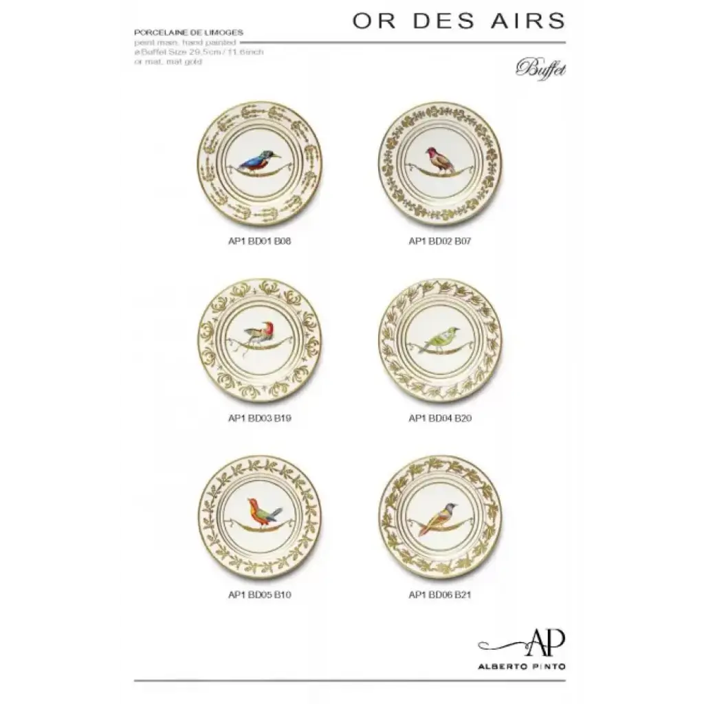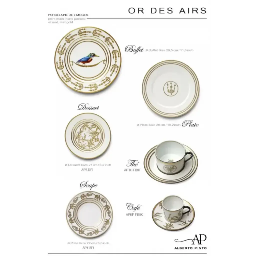 French for "gold from the air", this charming dinnerware has a flighty flock of birds framed by branches and matte gold accents. Or Des Airs is designed to mix and match with the Or Des Mers dishes. Designed by Alberto Pinto. One of France’s best-known interior designers, Alberto Pinto has designed not only homes but also yachts, private jets, luxury hotels, and restaurants. His work has been called the "haute couture of interior decorating." His prolific creations range in style from modern to classical to Asian-inspired and floral themes, and all of them are executed superbly on Limoges porcelain to create art for your table.