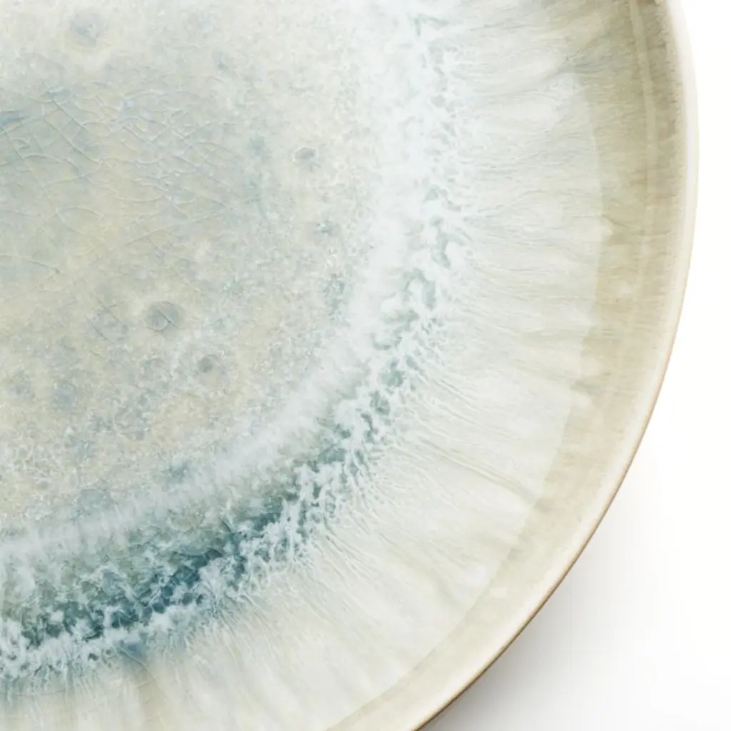 Awash in serene shades of green, grey and blue, our Ora platter enchants with clean lines and the unpredictable nature of reactive glaze. Hand-applied glaze sheets, pools and crackles on the plate in a captivating array that's unique to each piece. Suggestive of water washing over a sandy beach, Ora sets a striking table for casual dinners as well as formal affairs.
