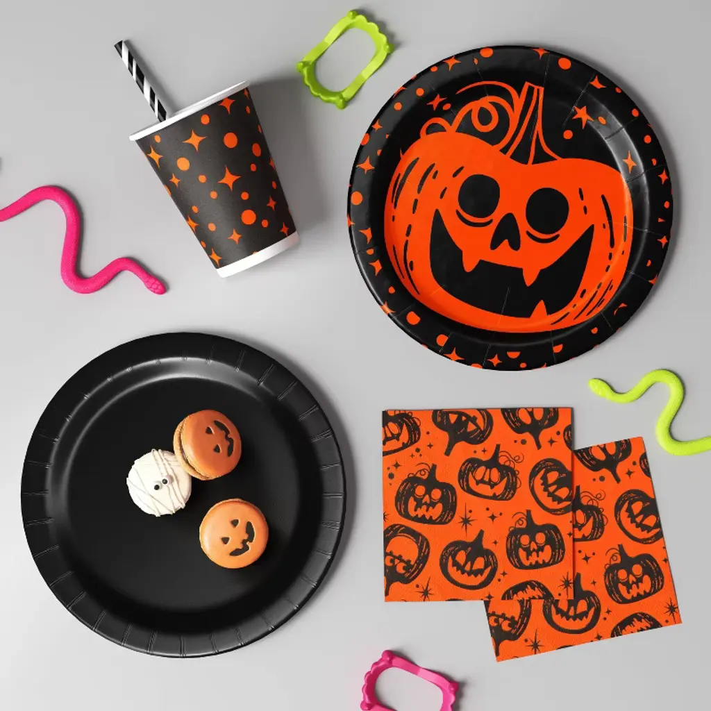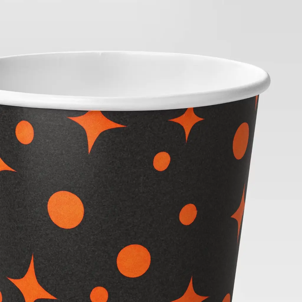 Serve beverages to your guests in festive style these Orange Sparkle Disposable Cups from 10-Count Hyde and EEK! Boutique™. These Halloween paper cups feature allover star and dot print graphics with sparkle accents in orange on a black backdrop for fun style. Suitable for serving a variety of drinks, you can toss them in the trash after use for convenient post-party cleanup.Hyde and EEK! Boutique™: Thrilling delights. Curious oddities.