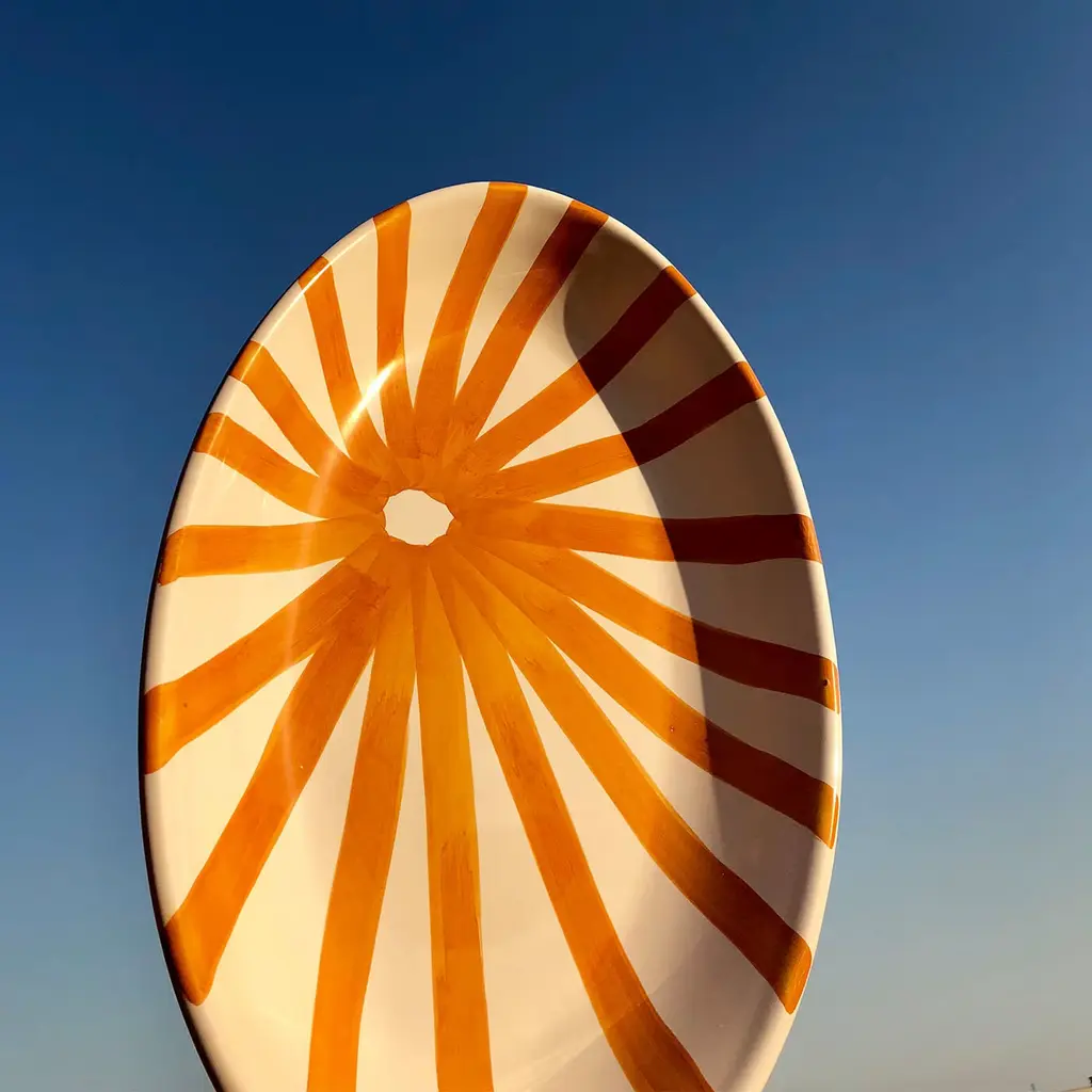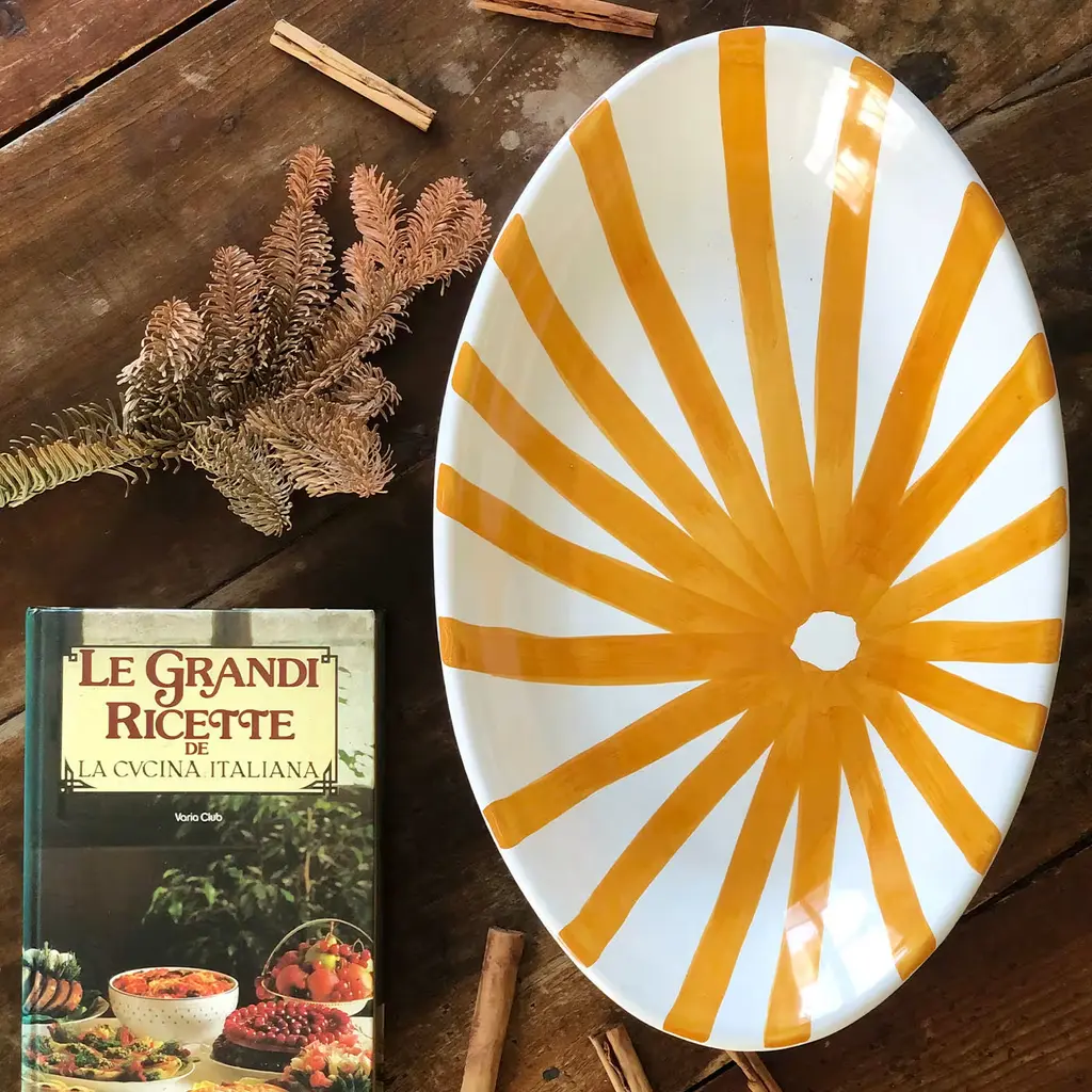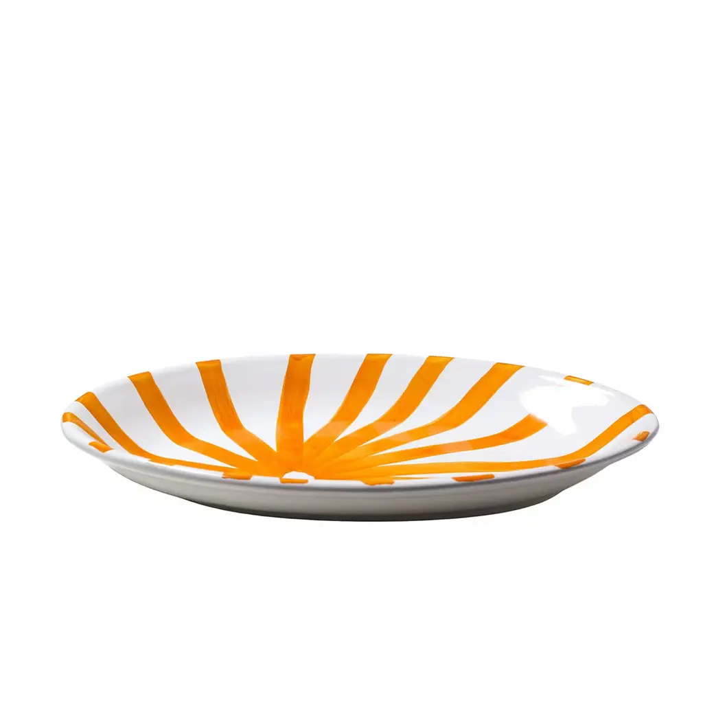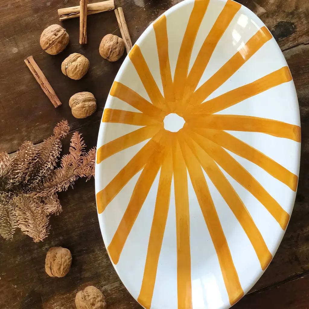 Perfect to serve appetizing salads and pasta dishes or as a centerpiece with fresh fruits, this large oval plate displays a vibrant decoration of orange stripes arranged in a radial pattern. Available in other colors only on request, this serving plate is entirely crafted and painted by hand therefore any variation is not to be considered a product flaw but rather a testament to its exquisite craftsmanship. Certified for food safety. The decoration can be made-to-order in other colors, please contact the Concierge for details.