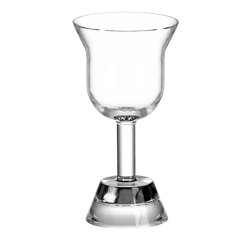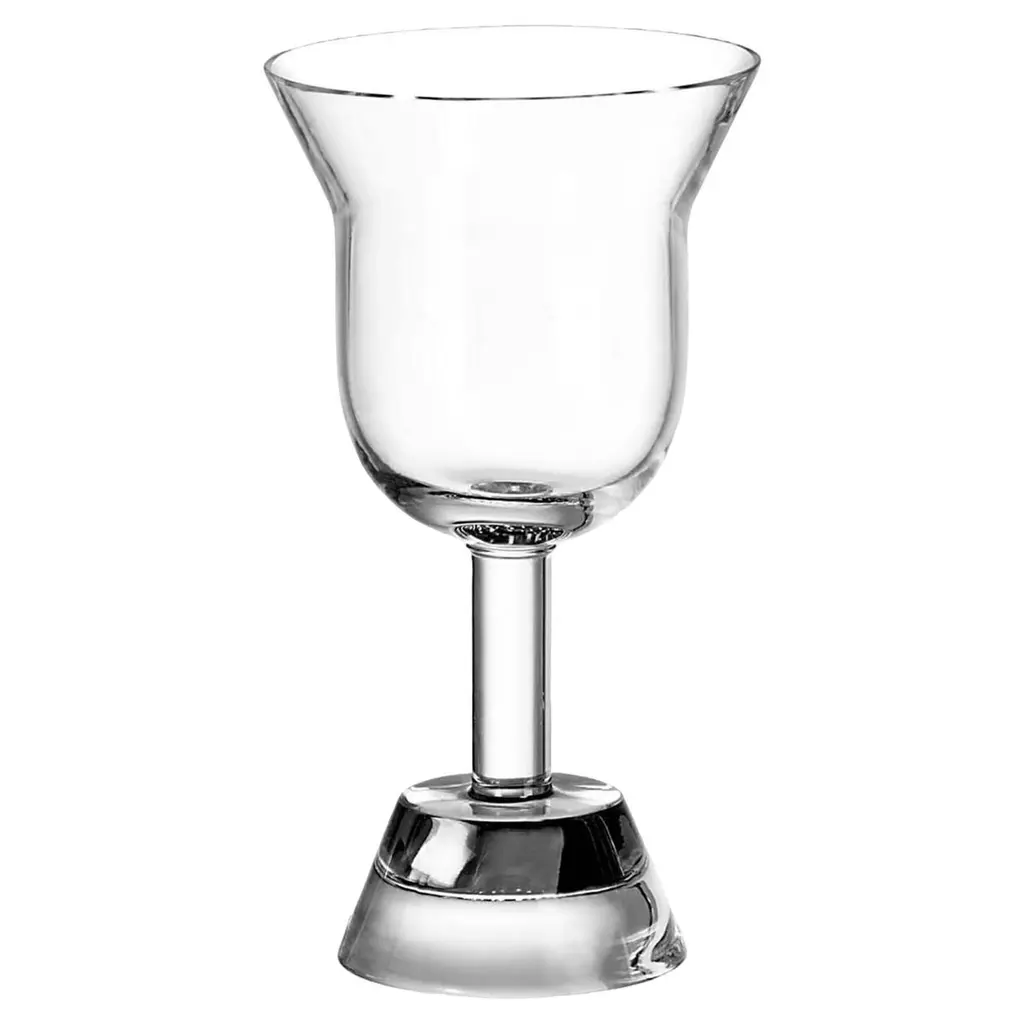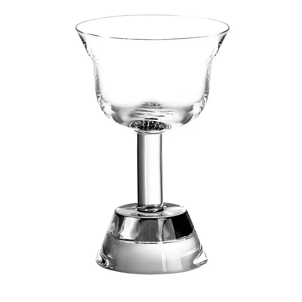 This exquisite set of two white wine goblets was designed by Ettore Sottsass Jr. in 1999 as part of the Orfeo Collection of elegant pieces to enliven a modern dining table. Combined in multiples and with the other sets of the same series, the interplay of different thicknesses and bold proportions is a pleasure for the senses, enhanced by the transparent brightness of crystal. Each piece is crafted by hand using traditional methods and measures 136 mm in height and 82 mm in diameter with a capacity of 15 cl.