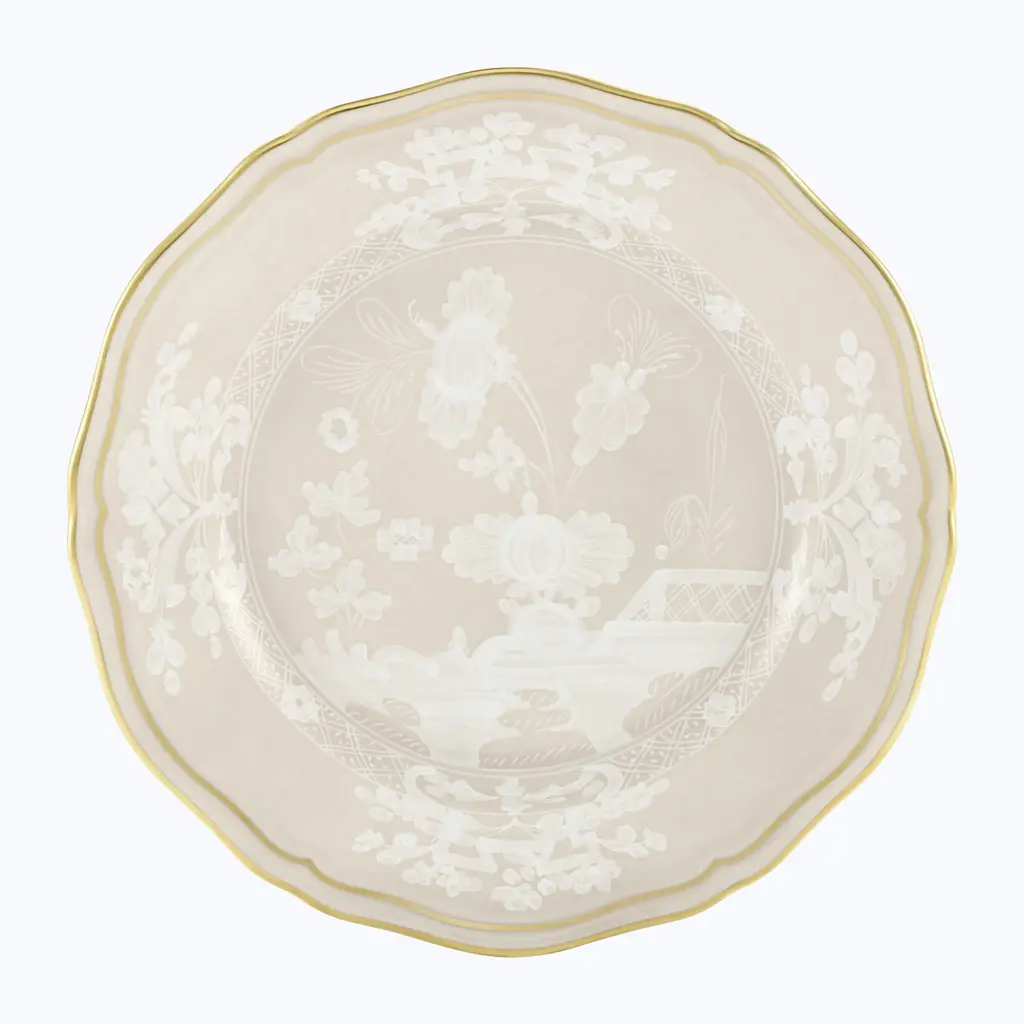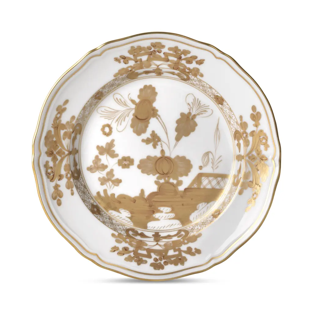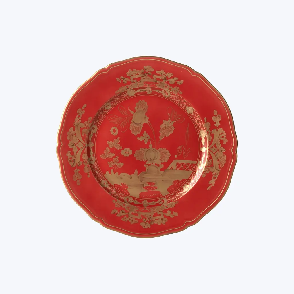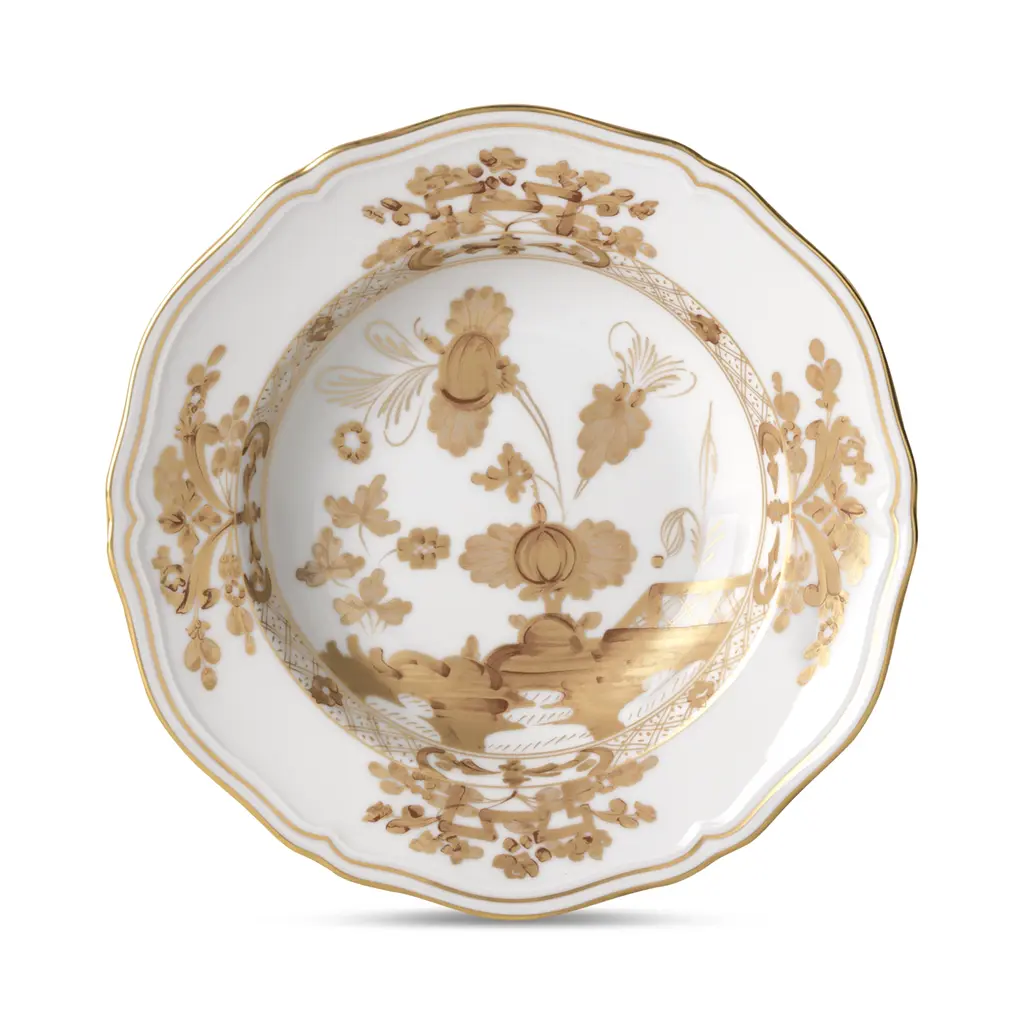 This Oriente Gold Charger Plate is characterized by fine porcelain embellished with a delicate floral ornament in hand-painted pure gold that traces the lines of the classic Antico Doccia, distinctive of the Florentine Maison, that exudes Italian craftsmanship. Each piece of stunning porcelain is a work of art and a piece of history – the Ginori 1735 atelier of expert artisans was founded in the 18th century, merging timeless elegance with beautiful craftsmanship.The Oriente Italiano Gold Collection is the ultimate expression of statement pieces: the precious materials used and the eclectic style of the collection make it the star of any table setting – an expression of a unique and timeless lifestyle. This new collection gives full expression to the concept of expert craftsmanship, paying homage to Italian savoir-faire, and features two exquisite new colorways: Aurum, in white, and Rubrum, in red, both hand-decorated with pure gold. The table setting is completed by plates, soups, dessert dishes, and bread dishes of the same line that can also be mixed and matched with other colorways from the Oriente Italiano collection for infinite combinations, where every composition is unique and beautiful.