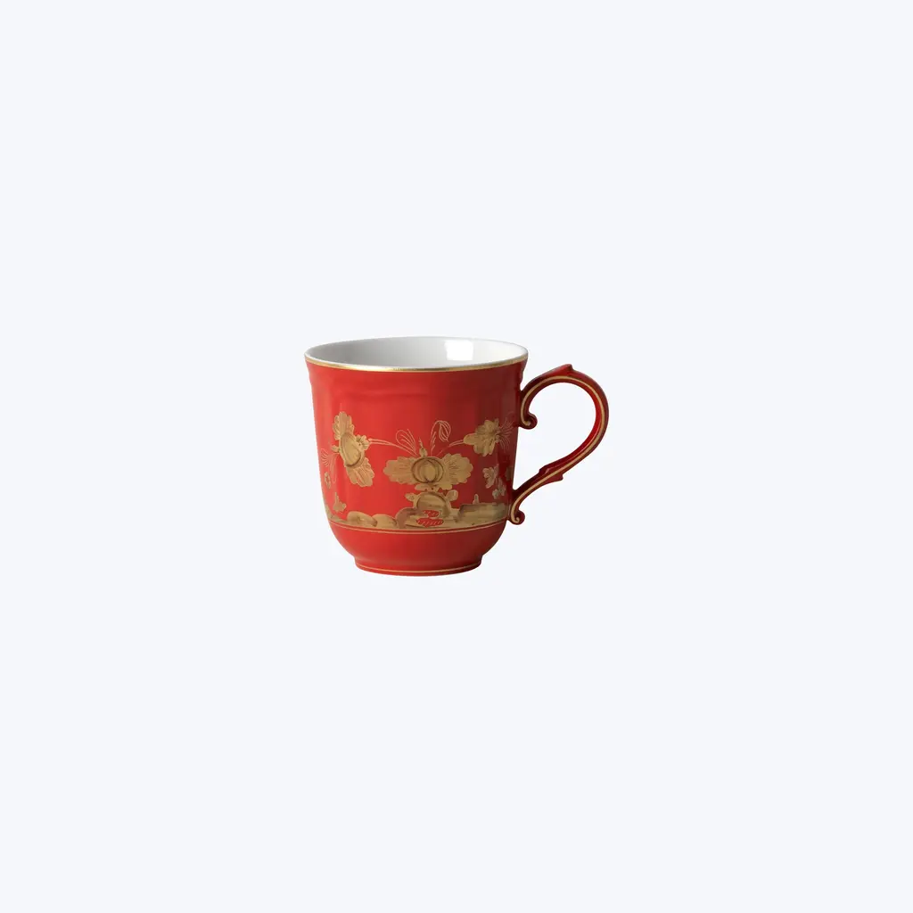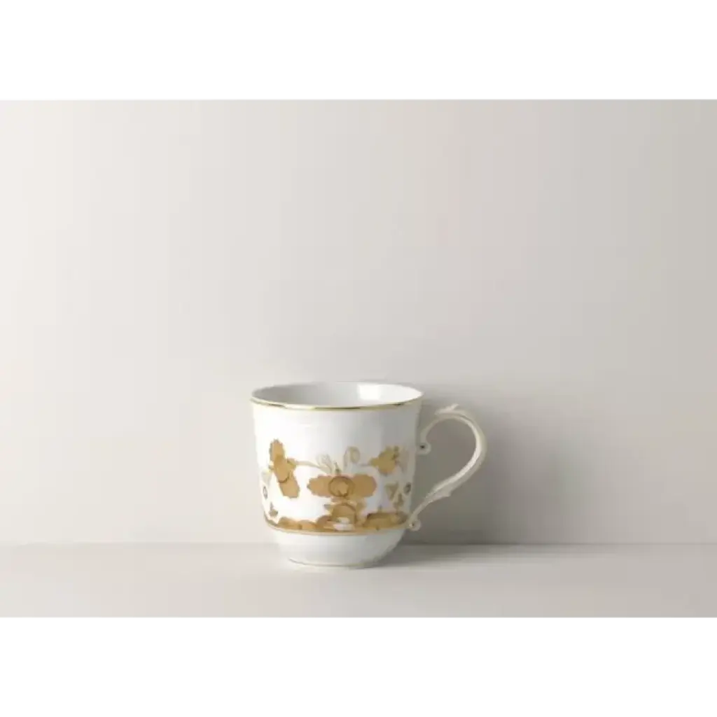 This Oriente Gold Mug is characterized by fine porcelain embellished with a delicate floral ornament in hand-painted pure gold that traces the lines of the classic Antico Doccia, distinctive of the Florentine Maison, that exudes Italian craftsmanship. Each piece of stunning porcelain is a work of art and a piece of history – the Ginori 1735 atelier of expert artisans was founded in the 18th century, merging timeless elegance with beautiful craftsmanship.The Oriente Italiano Gold Collection is the ultimate expression of statement pieces: the precious materials used and the eclectic style of the collection make it the star of any table setting – an expression of a unique and timeless lifestyle. This new collection gives full expression to the concept of expert craftsmanship, paying homage to Italian savoir-faire, and features two exquisite new colorways: Aurum, in white, and Rubrum, in red, both hand-decorated with pure gold. The table setting is completed by plates, soups, dessert dishes, and bread dishes of the same line that can also be mixed and matched with other colorways from the Oriente Italiano collection for infinite combinations, where every composition is unique and beautiful.