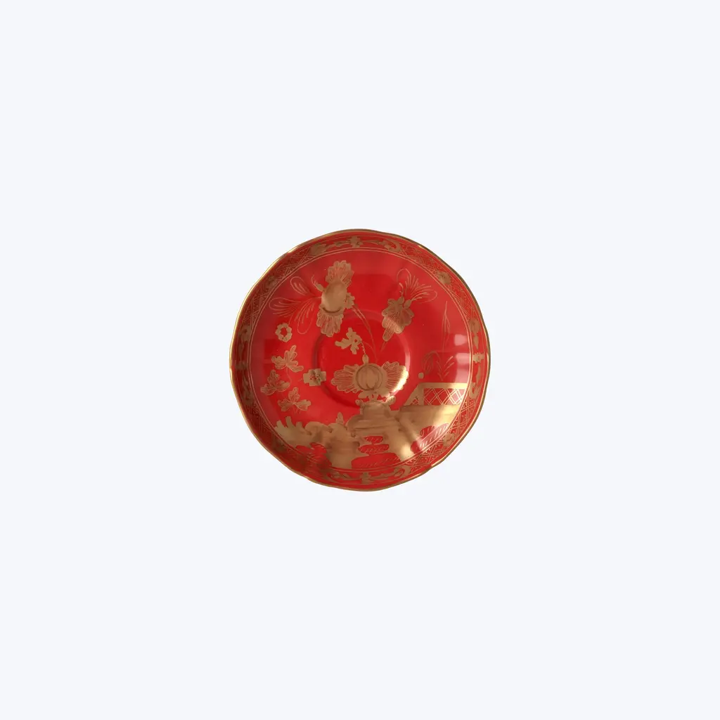 This Oriente Gold Tea Saucer is characterized by fine porcelain embellished with a delicate floral ornament in hand-painted pure gold that traces the lines of the classic Antico Doccia, distinctive of the Florentine Maison, that exudes Italian craftsmanship. Each piece of stunning porcelain is a work of art and a piece of history – the Ginori 1735 atelier of expert artisans was founded in the 18th century, merging timeless elegance with beautiful craftsmanship.The Oriente Italiano Gold Collection is the ultimate expression of statement pieces: the precious materials used and the eclectic style of the collection make it the star of any table setting – an expression of a unique and timeless lifestyle. This new collection gives full expression to the concept of expert craftsmanship, paying homage to Italian savoir-faire, and features two exquisite new colorways: Aurum, in white, and Rubrum, in red, both hand-decorated with pure gold. The table setting is completed by plates, soups, dessert dishes, and bread dishes of the same line that can also be mixed and matched with other colorways from the Oriente Italiano collection for infinite combinations, where every composition is unique and beautiful.