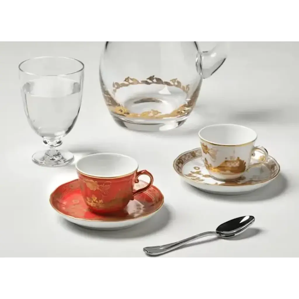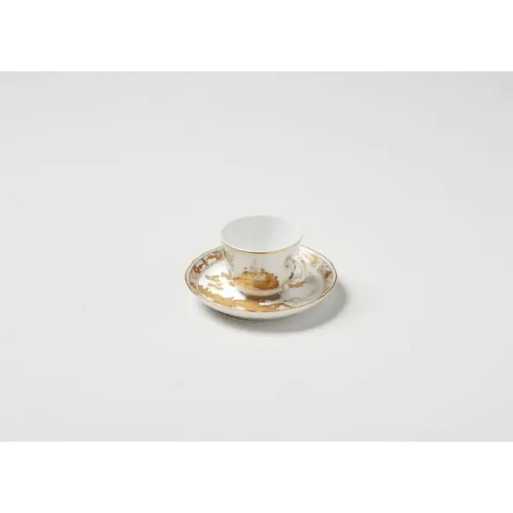 Set of two porcelain coffee saucers with Aurum decoration in pure gold. Oriente Italiano Gold Collection. The two coffee plates are distinguished by the floral decoration in hand-painted pure gold that stands out against the white porcelain and runs along the classic lines of Antico Doccia, distinctive of the Maison. They are designed in combination with coffee cups of the same line to live intense moments of relaxation. The Oriente Italiano Gold Collection also consists of tableware and tea sets, furnishing accessories and original fragrance diffusers for environments. It is also available in the Rubrum version, for sophisticated mise en place with an unique Ginori 1735 style.