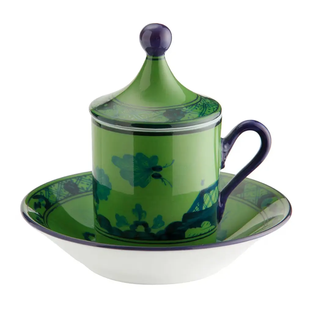 This stunning set of two espresso cups with lids and saucers is a superb interpretation of a staple in any Italian tableware collection. Crafted entirely of porcelain, it comprises two cups of cc 80 capacity and two 11 cm wide saucers. The dark blue decoration over the delicate yellow background of this set, part of the Oriente Italiano Collection, is inspired by a mix of Far East décors and Florentine pottery traditions. It can be paired with other items in the same collection.