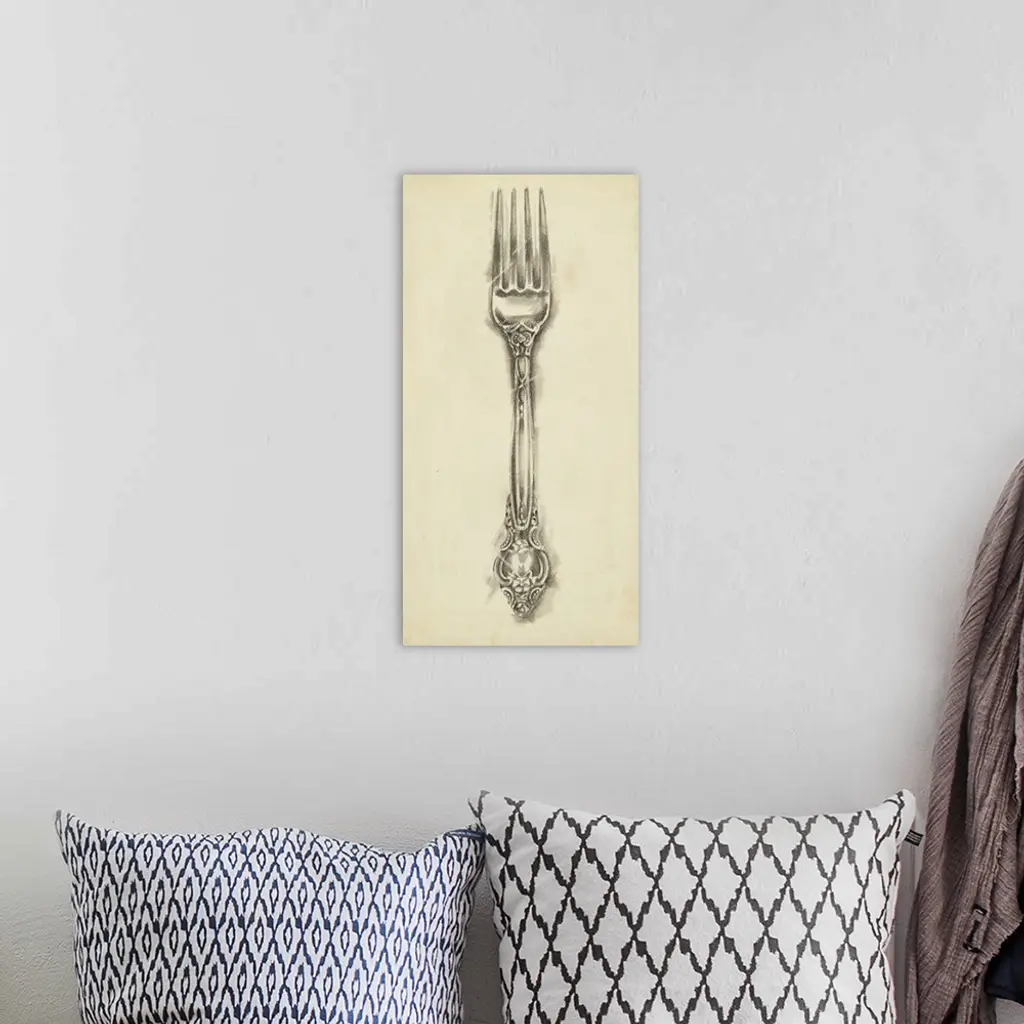 Home decor artwork perfect for any kitchen of an antique silver fork against a beige distressed background.