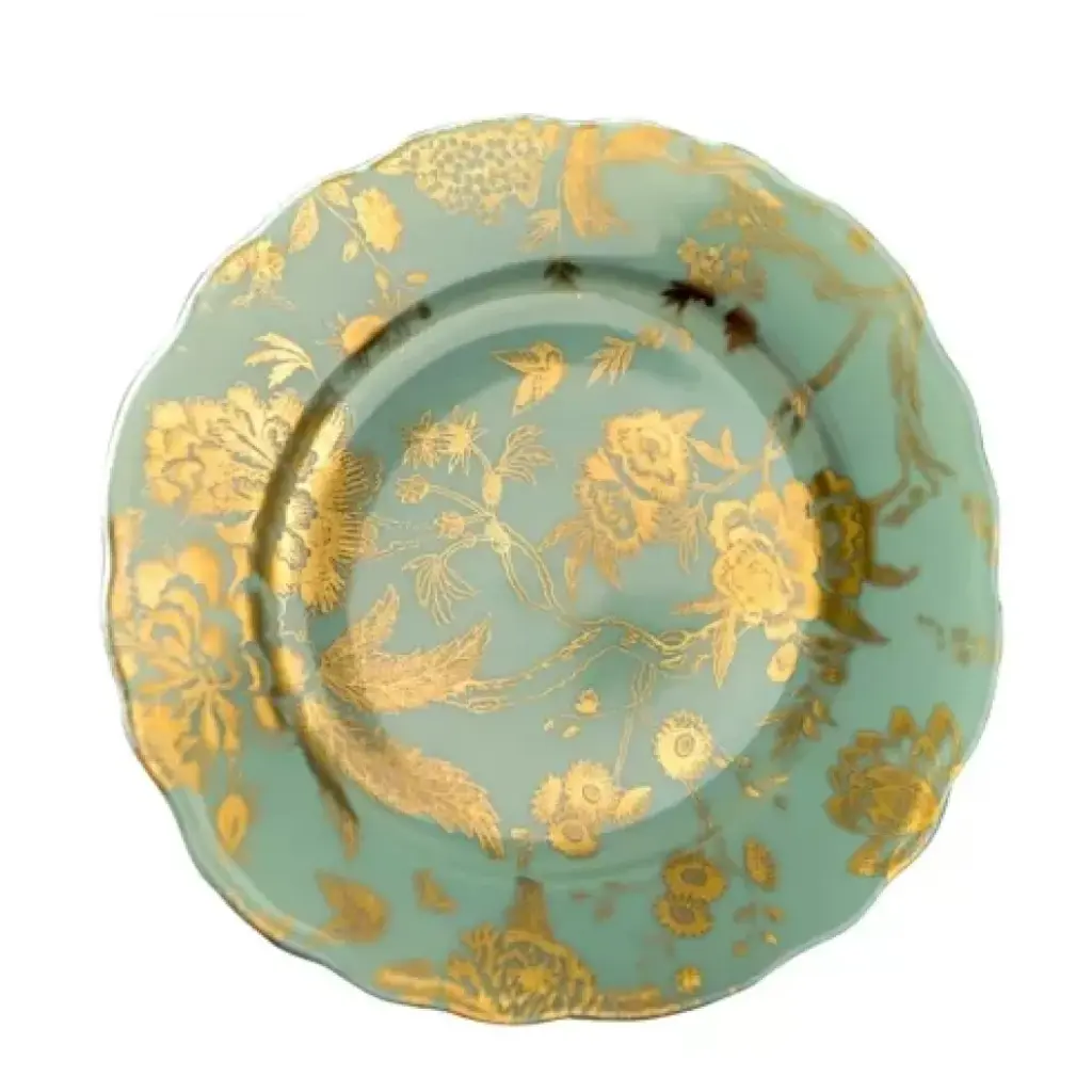 Over the centuries, our Manifattura has collaborated with multiple artists, gifted in knowing how to bring to life splendid designs and motifs to be transformed into decorations with a unique and inimitable flair. In 1740, at the near start of our journey, one of these artists, the Florentine painter Ferdinando Campostrini, created the celebrated floral hatchings featuring Ji Ondori roosters. Elegant animals that symbolize the virtue of boldness according to the oriental traditions the artist held dear. His sketches were expertly rendered as decorative designs for the iconic Vecchio Ginori line, giving life to the timeless Oro di Doccia Ginori gilded porcelain collection. A collection with a staggering and exquisite modernity that spills over onto the porcelain plates and other tableware edged in gold: a long-standing hallmark of ours. The entire collection is available in the shades of light blue, green and red.