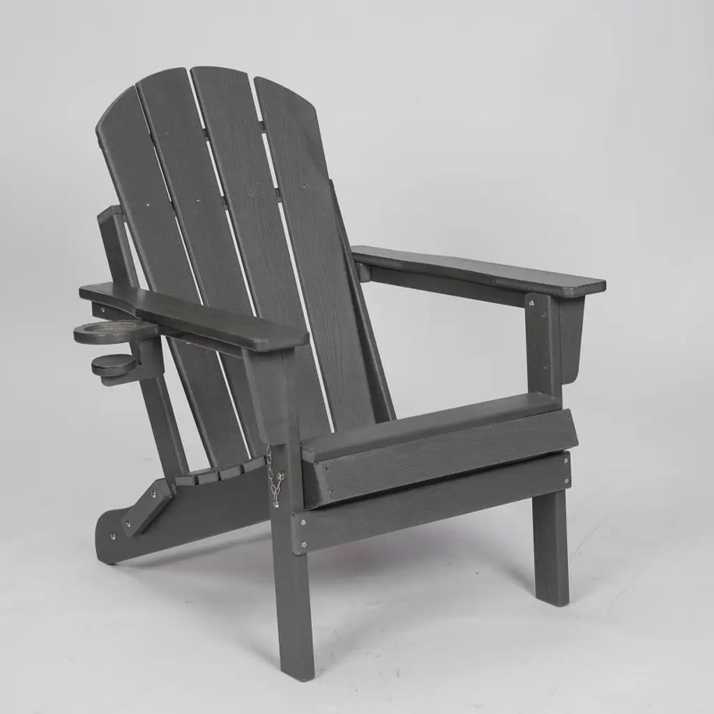Orrd Hdpe Folding Adirondack Chair With Dual Cup Holders, Wood Texture Composite Outdoor Chair, Gray