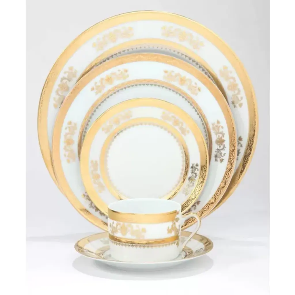 The rich Orsay dinnerware collection features luxurious accents of gold with a choice of colors: black, cobalt, powder blue, red or white. Five piece place setting includes dinner plate, dessert plate, bread & butter plate, teacup and saucer. Founded in 1826, Deshoulières is the leading French porcelain maker today. Their fine white Limoges porcelain is strong enough for everyday use. Their style is well known around the world. The painters and decorators have generations of knowledge. Inspired by trends from both interiors and fashion, their patterns are always refined. Deshoulières embodies a true spirit of French style. With their new collections, Deshoulières delights everyone from homeowners to professional chefs. Invite elegance to your table with Deshoulières.