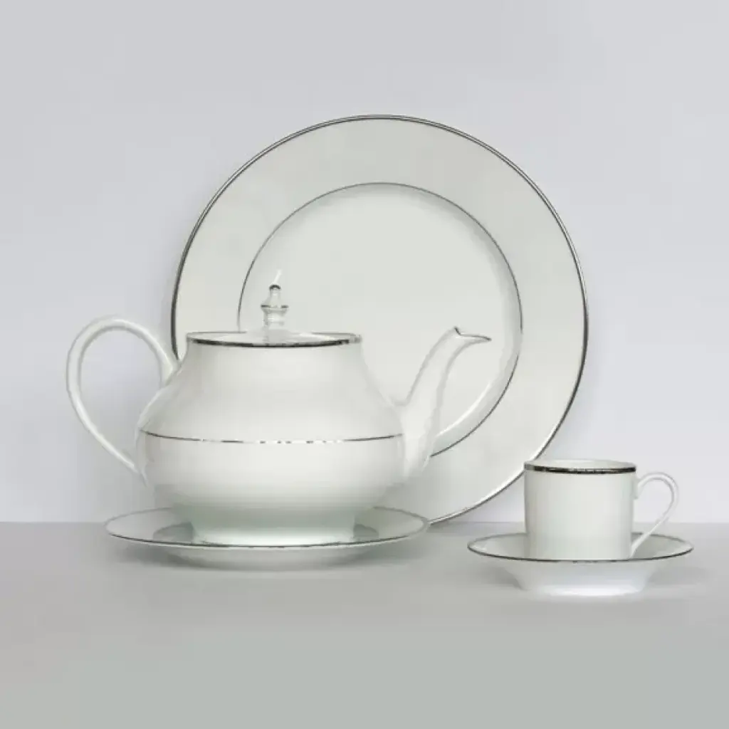 Orsay Dinnerware from Haviland is a simply classic design of platinum and white Limoges porcelain. 5-Piece Place setting includes Dinner plate, Dessert Plate, Bread & Butter Plate, Tea cup & Tea Saucer. Haviland Porcelain was founded by David Haviland, an American who moved from New York to France after he was brought a broken tea cup to match and recognized the quality and color of the old piece of porcelain. Filled with curiosity, he went to France to find the factory where the cup had been made, but the samples he was sent were not up to his standards. So in 1841, he moved to Limoges to set up his own factory. Traditional French dinnerware was usually produced in Limoges and sent to Paris for decoration. Haviland insisted on setting up a studio within his factory to have more control over the designs. Renowned artists, including Cocteau, Dali, and Kandinsky have played a role in the company's designs. Today, Haviland is one of the premier names in French porcelain dinnerware, sought by collectors all over the world. Clients have included the White House, Empress Eugenie, General de Gaulle, Jacques Chirac, the Emperor of Japan, and the Royal Court of Morocco.