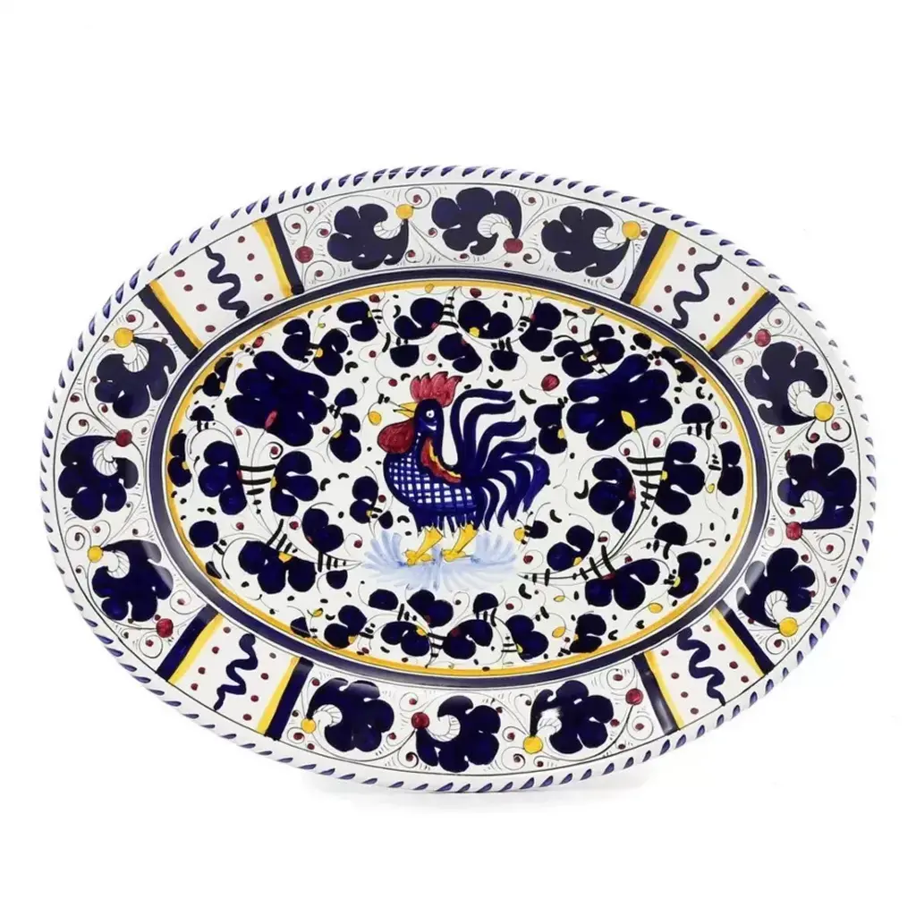 ORVIETO Green, Red, Blue Collections: The Orvieto (or Orvietano) design is a very old and traditional pattern that originated during the Renaissance in the hill-top town of Orvieto Italy. Truly one of Italy's most unique and interesting cities, Orvieto has a charming medieval character, mainly due to its celebrated Cathedral, a gem of Gothic architecture that took more than 100 years to build. The 'Galletto' (Rooster) pattern's main motif is a crowing rooster that symbolizes good wishes for blessings, prosperity and well-being. Hand made in Deruta-Italy. All Deruta of Italy products are lead and cadmium Free. - Dishwasher Safe Not recommended for microwave use. Size (inches): 13 DIAM.