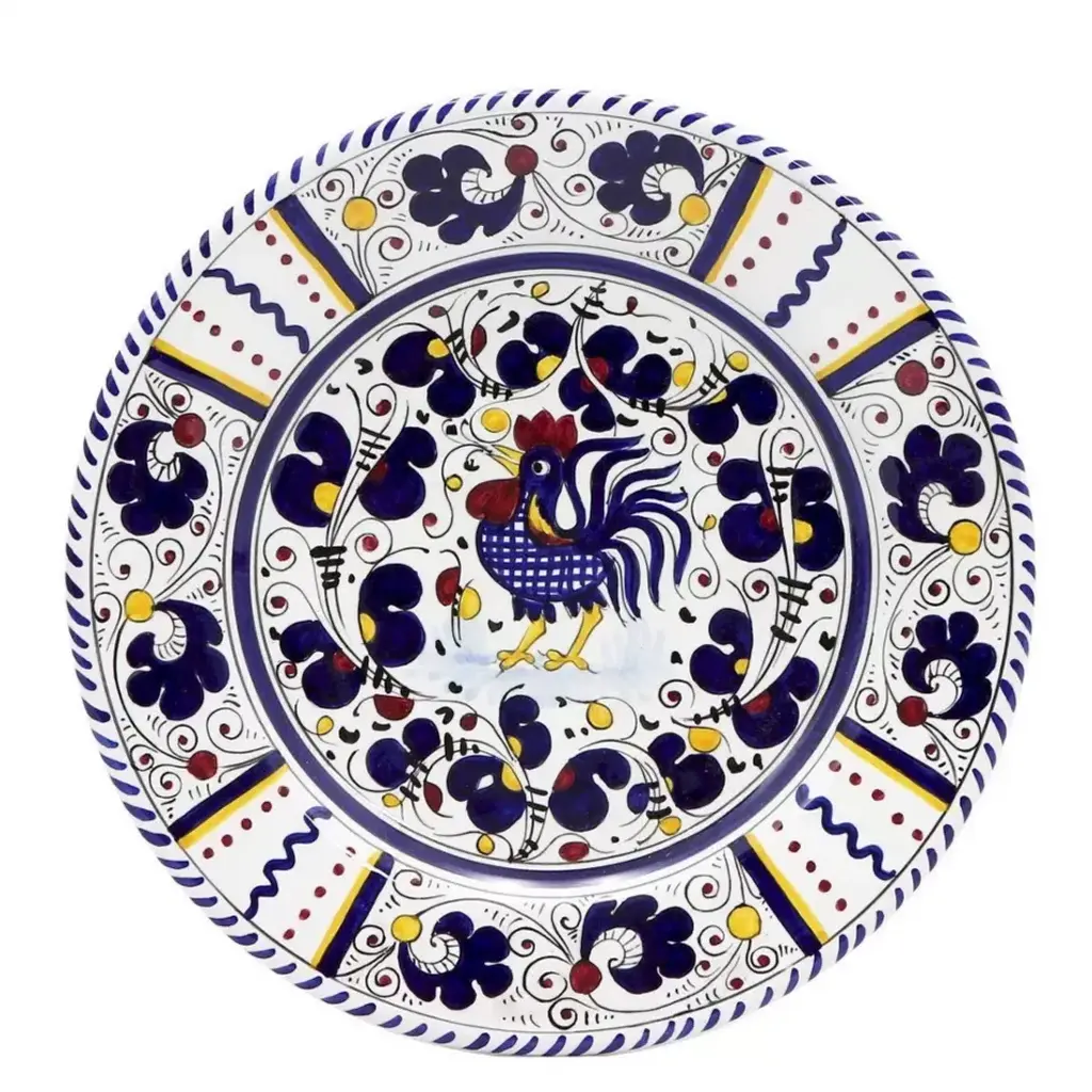 ORVIETO Green, Red, Blue Collections: The Orvieto (or Orvietano) design is a very old and traditional pattern that originated during the Renaissance in the hill-top town of Orvieto Italy. Truly one of Italy's most unique and interesting cities, Orvieto has a charming medieval character, mainly due to its celebrated Cathedral, a gem of Gothic architecture that took more than 100 years to build. The 'Galletto' (Rooster) pattern's main motif is a crowing rooster that symbolizes good wishes for blessings, prosperity and well-being. Hand made in Deruta-Italy. All Deruta of Italy products are lead and cadmium Free. - Dishwasher Safe Not recommended for microwave use. Size (inches): 5 DIAM. x 12 LONG