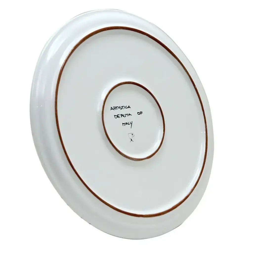 Here the original Deruta Pizza Plate used by renown Neapolitan style Pizzeria restaurants throughout the world and definitely a great addition to your own dinnerware. Great to be used as cake of cheese platter. ORVIETO Rooster Collections: The Orvieto (or Orvietano) design is a very old and traditional pattern that originated during the Renaissance in the hill-top town of Orvieto Italy. Truly one of Italy's most unique and interesting cities, Orvieto has a charming medieval character, mainly due to its celebrated Cathedral, a gem of Gothic architecture that took more than 100 years to build. The 'Galletto' (Rooster) pattern's main motif is a crowing rooster that symbolizes good wishes for blessings, prosperity and well-being. The Deruta of Italy products are synonymous of high artistic value where faithfulness to colors, design and techniques is evident in their splendid and painstakingly production that also feature an impeccable double fired pure white thick under-glaze to assure product brilliance and durability. Available in three colors: Red, Blue and Aqua Green. Hand made in Deruta-Italy. All Deruta of Italy products are 100% Food Safe. Dishwasher Safe Not recommended for microwave use. Size:12.5 DIAM. X .75 (3/4 ) HIGH