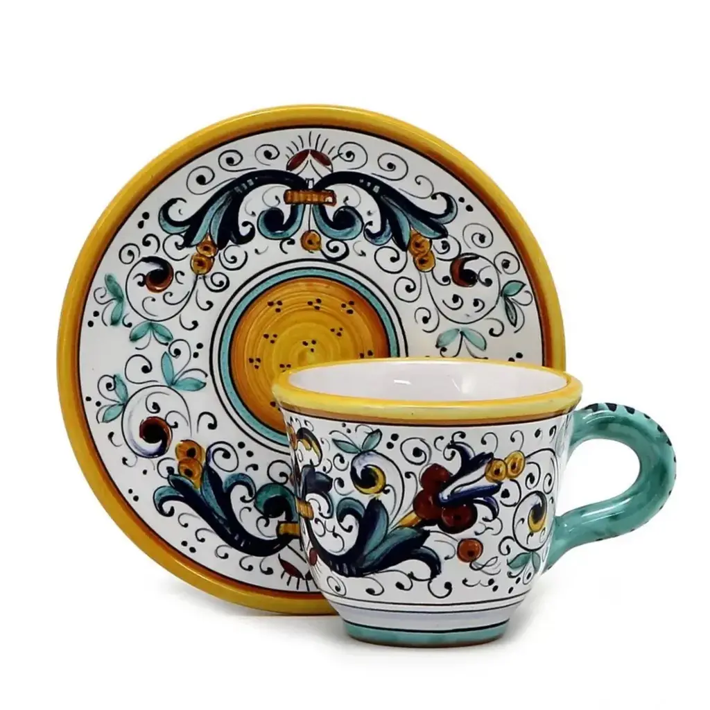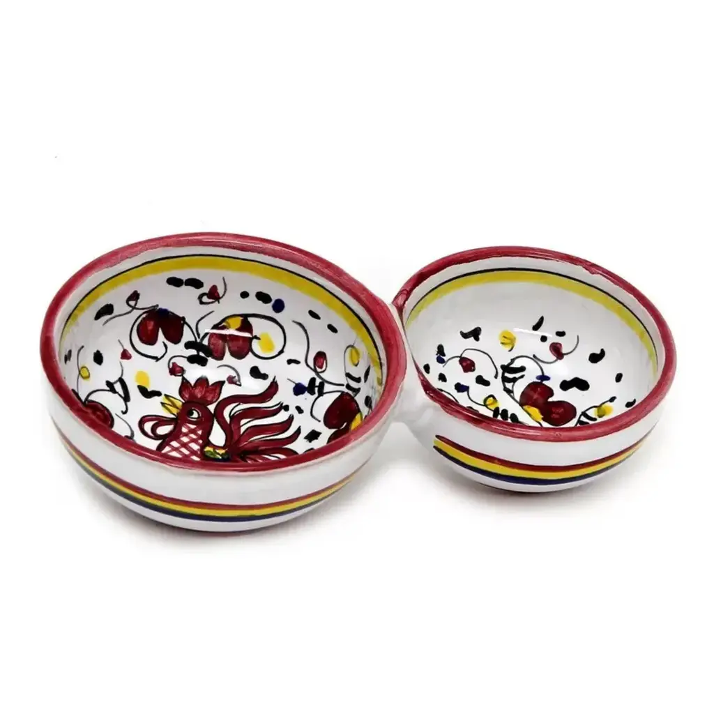 ORVIETO Green, Red, Blue Collections: The Orvieto (or Orvietano) design is a very old and traditional pattern that originated during the Renaissance in the hill-top town of Orvieto Italy. Truly one of Italy's most unique and interesting cities, Orvieto has a charming medieval character, mainly due to its celebrated Cathedral, a gem of Gothic architecture that took more than 100 years to build. The 'Galletto' (Rooster) pattern's main motif is a crowing rooster that symbolizes good wishes for blessings, prosperity and well-being. Hand made in Deruta-Italy. All Deruta of Italy products are lead and cadmium Free. - Dishwasher Safe Not recommended for microwave use.