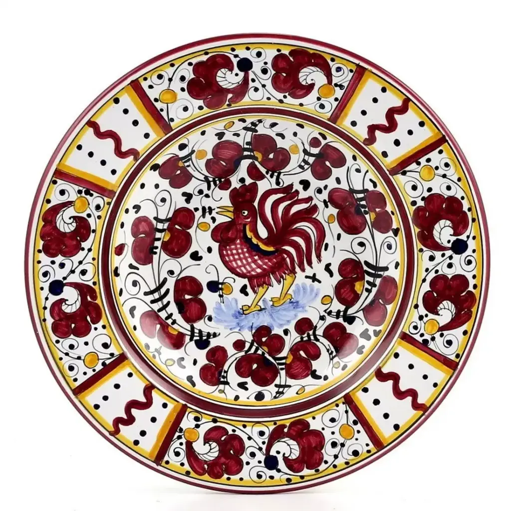 ORVIETO Green, Red, Blue Collections: The Orvieto (or Orvietano) design is a very old and traditional pattern that originated during the Renaissance in the hill-top town of Orvieto Italy. Truly one of Italy's most unique and interesting cities, Orvieto has a charming medieval character, mainly due to its celebrated Cathedral, a gem of Gothic architecture that took more than 100 years to build. The 'Galletto' (Rooster) pattern's main motif is a crowing rooster that symbolizes good wishes for blessings, prosperity and well-being. Hand made in Deruta-Italy. All Deruta of Italy products are lead and cadmium Free. - Dishwasher Safe Not recommended for microwave use. Size (inches): 15 DIAM.