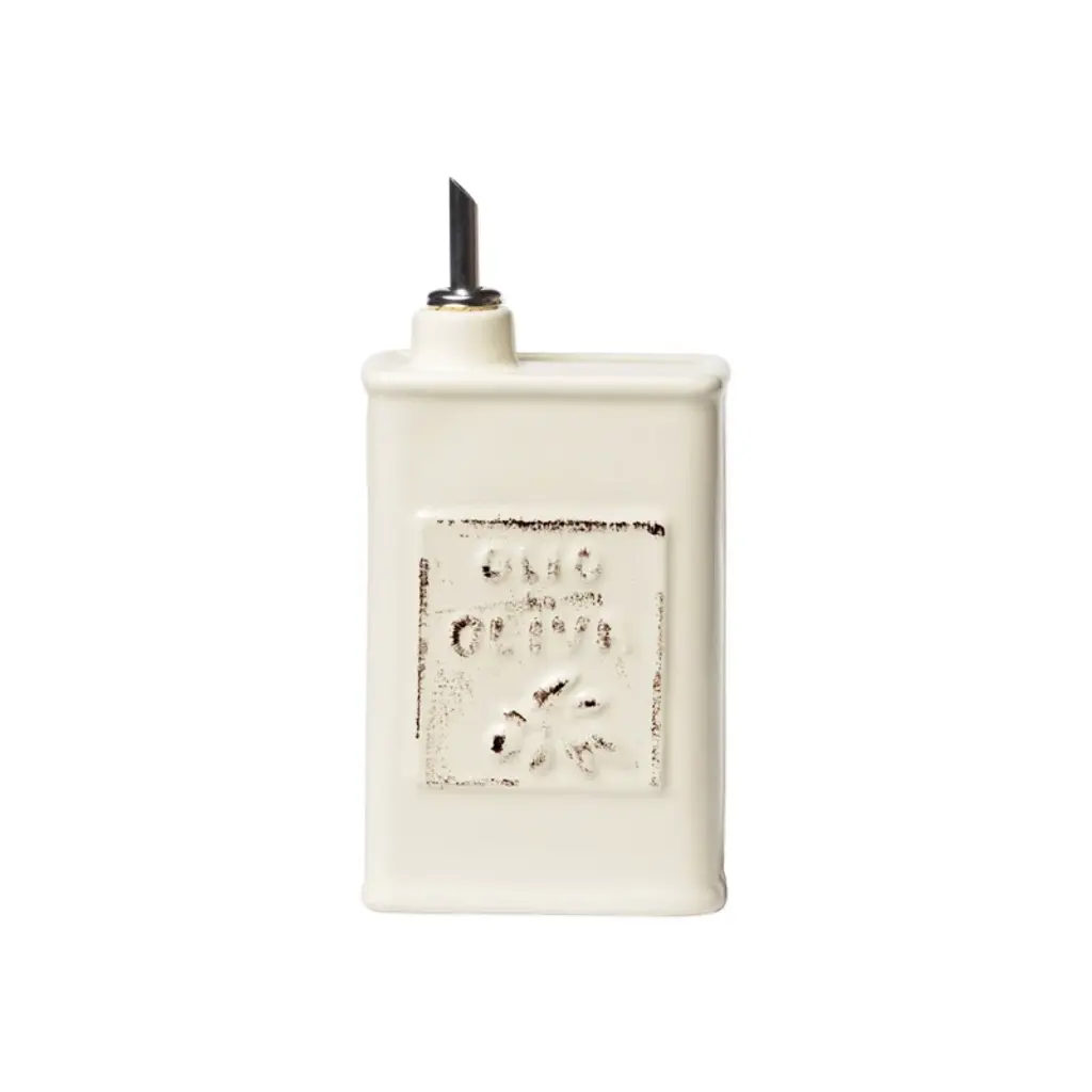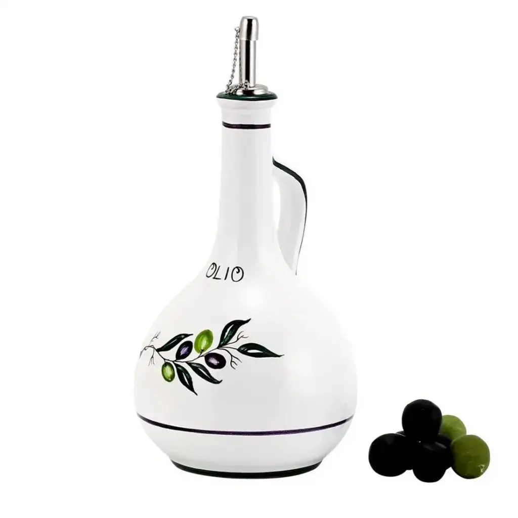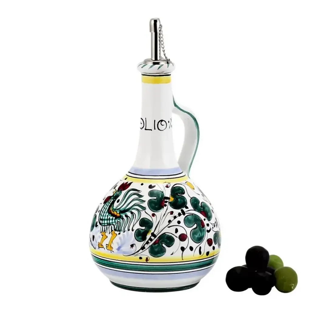 ORVIETO Green, Red, Blue Collections: The Orvieto (or Orvietano) design is a very old and traditional pattern that originated during the Renaissance in the hill-top town of Orvieto Italy. Truly one of Italy's most unique and interesting cities, Orvieto has a charming medieval character, mainly due to its celebrated Cathedral, a gem of Gothic architecture that took more than 100 years to build. The 'Galletto' (Rooster) pattern's main motif is a crowing rooster that symbolizes good wishes for blessings, prosperity and well-being. Comes with silicone or cork stainless steel pourer with cap. - 100% Food Safe - Earthenware Ceramic - Hand Made & Hand Painted in Deruta-Italy. Size: Bottle 4 DIAM. X 10 HIGH Bottle holds 24 Oz.