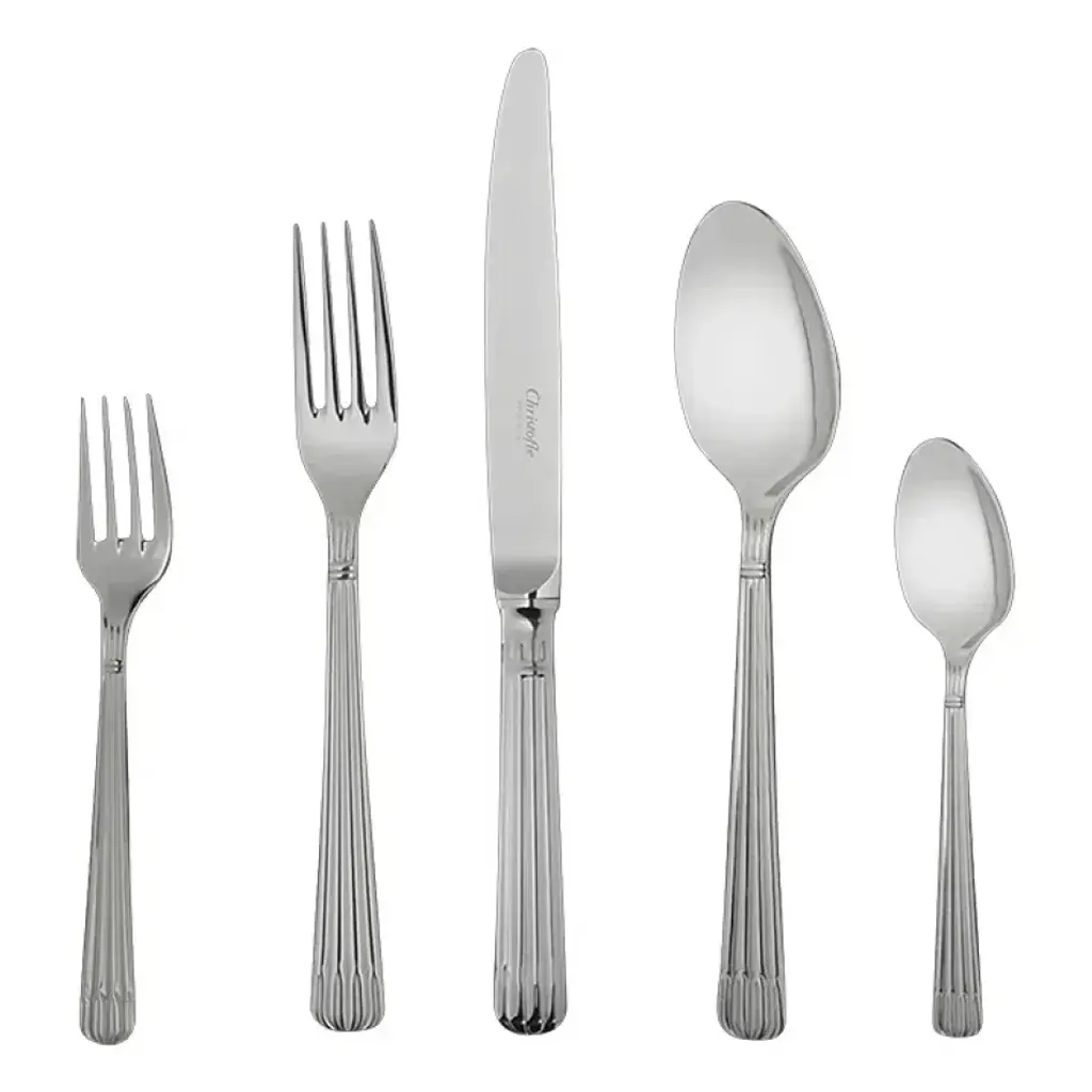 Designer Bernard Yot created the Osiris pattern in 1991 as an ode to the green, aquatic Egyptian landscape. Named after the god of transition, resurrection and regeneration, it is fitting that the striking signature ornamentation of the line is sturdy and useful papyrus reeds. Thanks to its creations in silver, Christofle is a symbol of luxury and elegance. Since its founding in the mid-19th century, it has been a continous innovative force and has infused each era with a new art of living. Thus, over time, this prestigious company has revolutionized styles, techniques, and methods for the production and distribution of silver plate and the decorative arts. A player in and privileged witness to the evolution of taste, customs, and traditions, Christofle has always seen its name associated with major creative trends, renowned artists such as Man Ray or Jean Cocteau, avant-garde architects such as Gio Ponti, and modernist silversmiths such as Lino Sabattini and Christian Fjerdingsatd, as well as present-day designers such as Andrée Putman, Martin Szekely or Ora ïto. Today, as in the past, whether gracing the tables of emperors, princes, or maharajas, in palaces, on board the Trans-Siberian Railway, Orient Express, or transatlantic ocean liners, or in the contemporary restaurants, Christofle continues to make an impression.