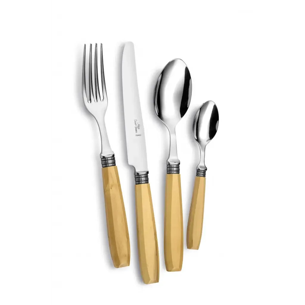 These items made from natural materials and may be variable in appearance. Alain Saint Joanis is a family-owned company that has been creating and manufacturing fine flatware in the purest tradition of French cutlery since 1876. These top-of-the-line collections are made with the finest quality silverplate and 18/10 stainless steel, with handles handcrafted from authentic, raw materials such as exotic woods, resins and enamels. All Alain Saint Joanis flatware is hand-assembled and hand-polished in France, and is dishwasher safe. Five-piece setting includes dinner knife, dinner fork, salad fork, soup spoon, and tea spoon.