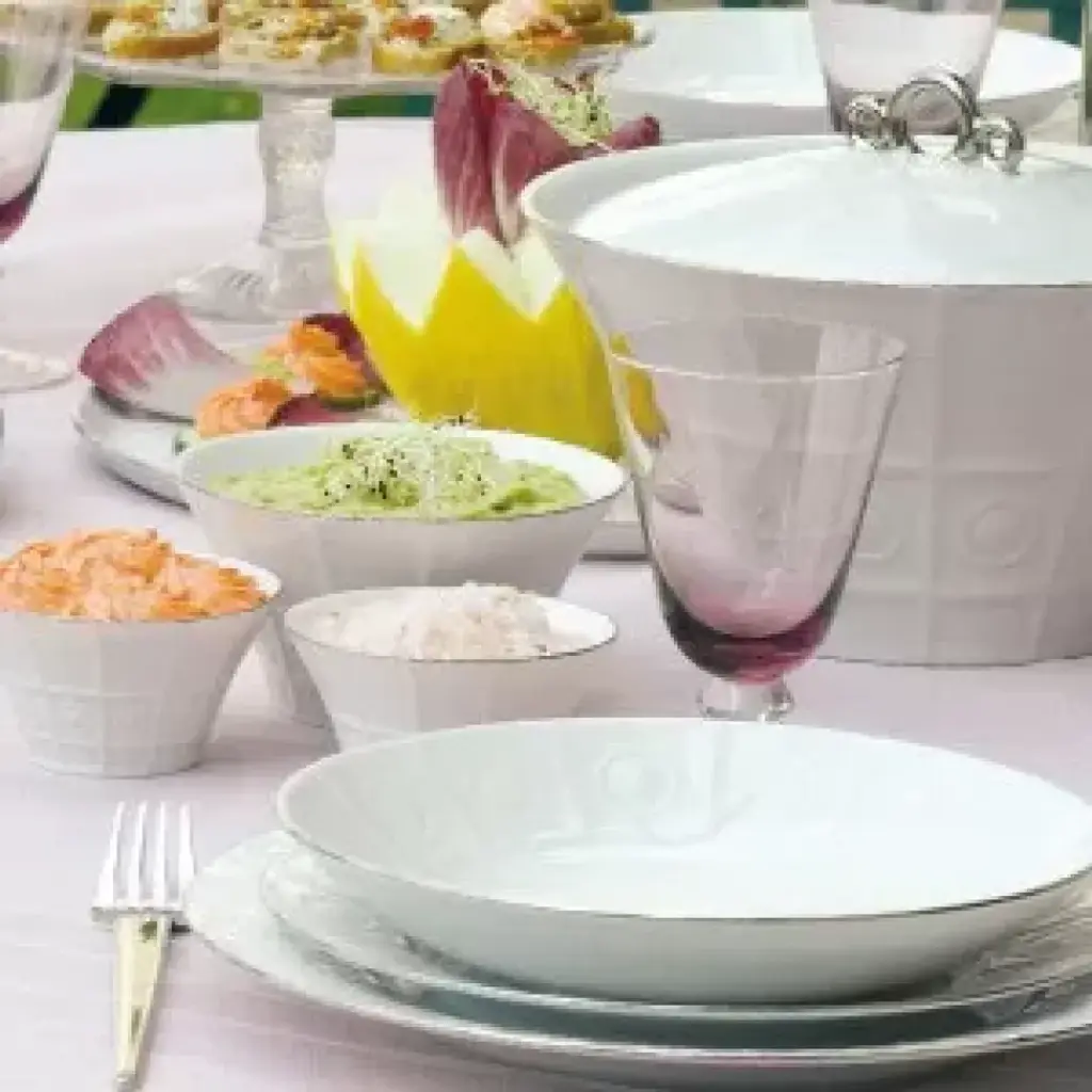 Our Osmose dinnerware is filled with geometric shapes and curves which meet in an avant-garde style with Art Deco inspiration. Made in France from Limoges porcelain. Founded in 1826, Deshoulières is the leading French porcelain maker today. Their fine white Limoges porcelain is strong enough for everyday use. Their style is well known around the world. The painters and decorators have generations of knowledge. Inspired by trends from both interiors and fashion, their patterns are always refined. Deshoulières embodies a true spirit of French style. With their new collections, Deshoulières delights everyone from homeowners to professional chefs. Invite elegance to your table with Deshoulières.