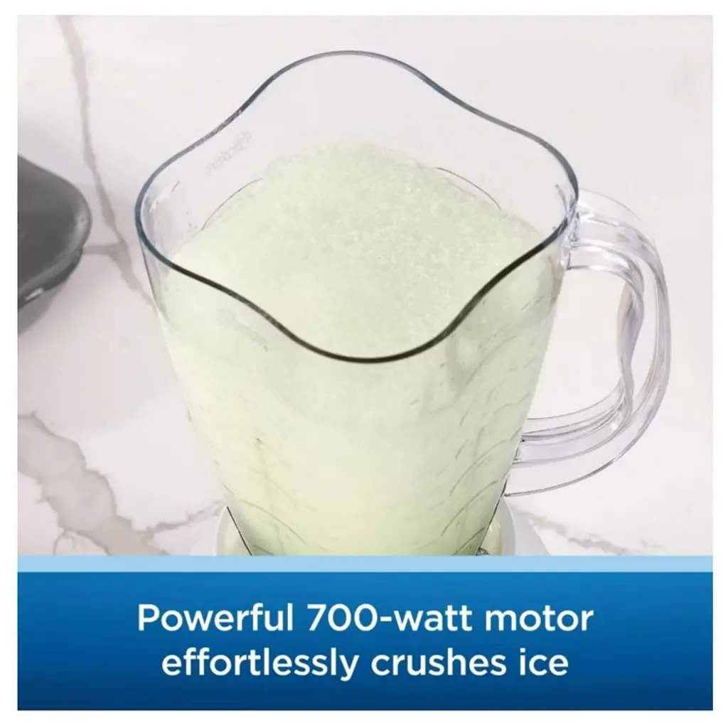 The Oster Classic Series 5-speed blender has 700 watts of power, for chunk-free smoothies and shakes, fresh vegetable soups, salsa, and more. The 5 speed settings and the easy-to-use control panel give you plenty of control. The easy-clean blending jar is BPA-free and dishwasher safe for easy cleaning. Crush ice, pulverize, and chop with precision using the stainless steel Crush Pro 4 blade, and rely on the Duralast All-Metal Drive, with the power to blend up to 10,000 smoothies. • Powerful kitchen blender offers 700 watts of ice crushing power• 5 speeds, including low, medium, high, and pulse, let you make the perfect soup, smoothie, salsa, and more• Stainless steel Crush Pro 4 Blade with a 4-point design pulverizes and chops with precision• Duralast All-Metal Drive with durable metal-to-metal connection allows you to blend up to 10,000 smoothies• Durable, easy-clean molded plastic finish• Color: White