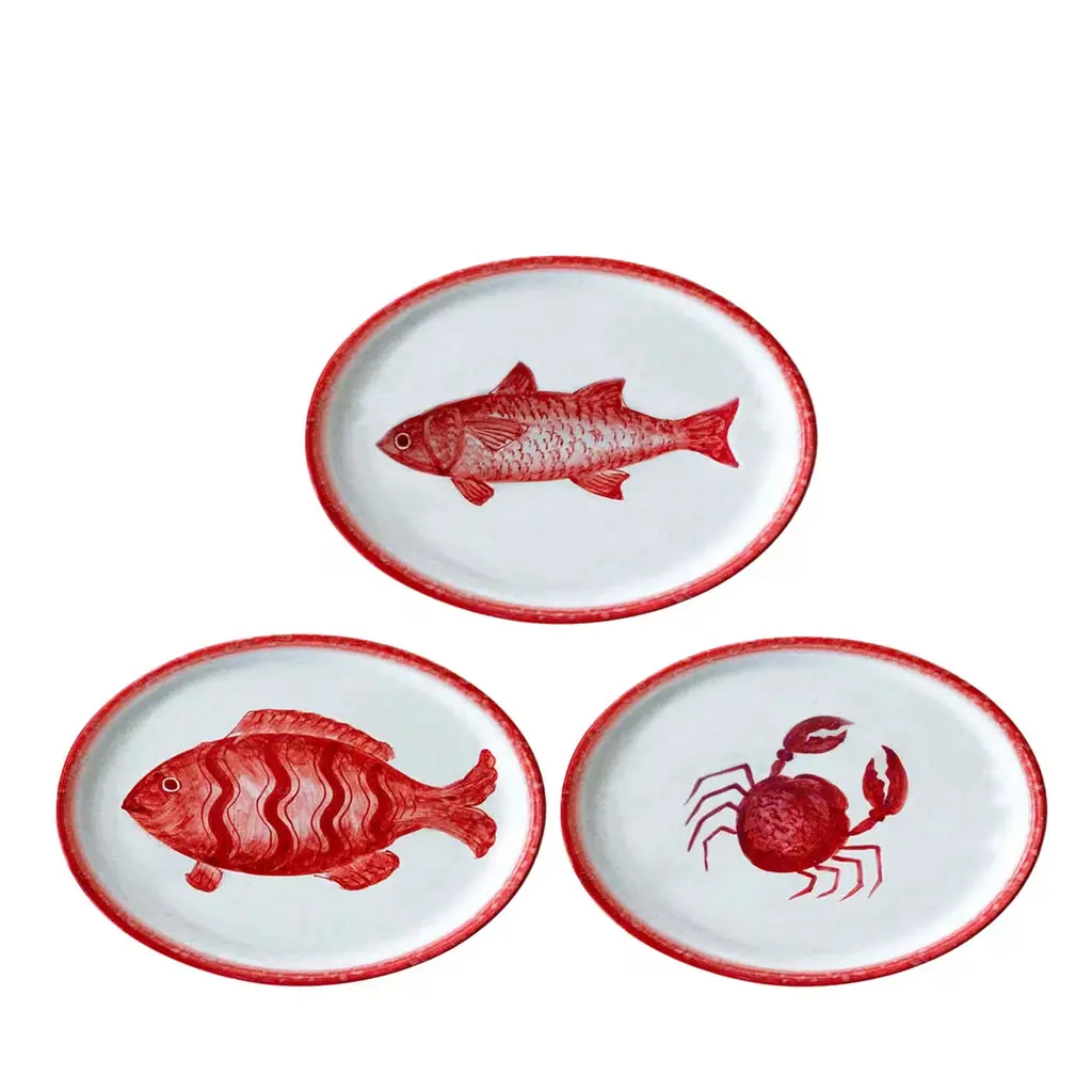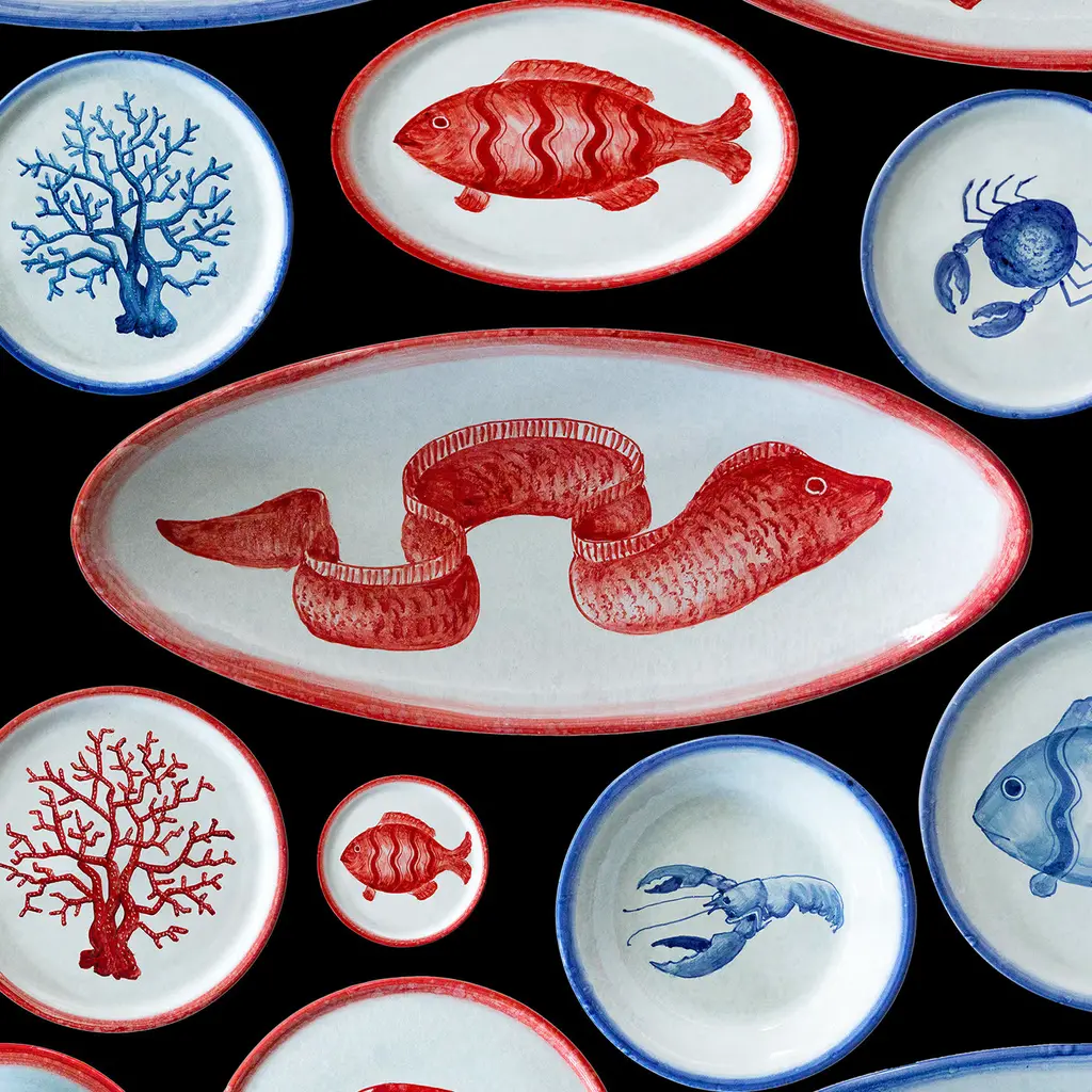 Fashioned of first-rate white ceramic, this polished set from the Osteria Decoro Mare Collection comprises six dinner plates that will bring an intense marine aesthetic to any table with the vibrancy of their red enamel. Each plate features a thin rim matching with the central zoomorphic decoration depicting a striped fish typical of the Mediterranean Sea rendered in captivating details.
