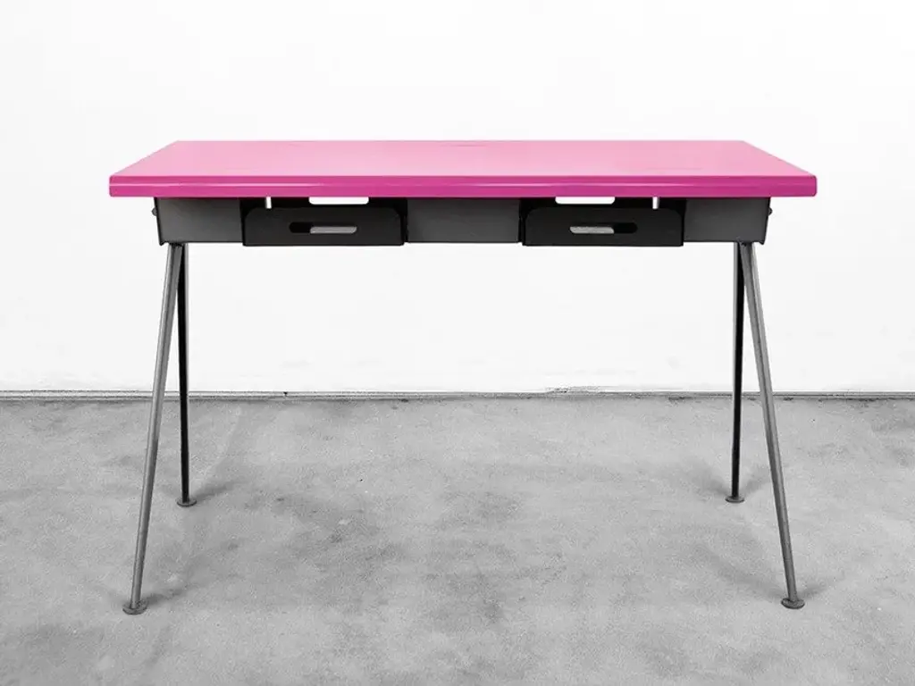 Writing desk inspired by the European design of the Fifties. Made of folded steel plate and equipped with removable drawers.The structure is characterized by simple geometrical traits which make it a light and unique object, available in a range of classical, lively and original colours.Materials: steelFinishes: steel, RAL