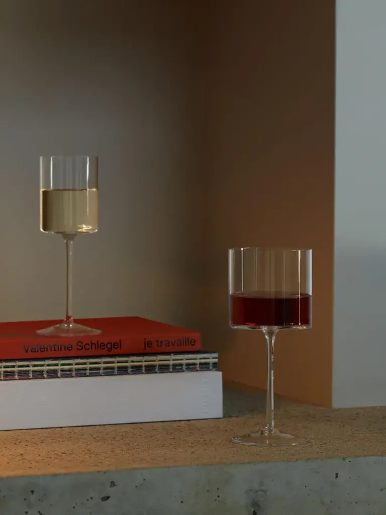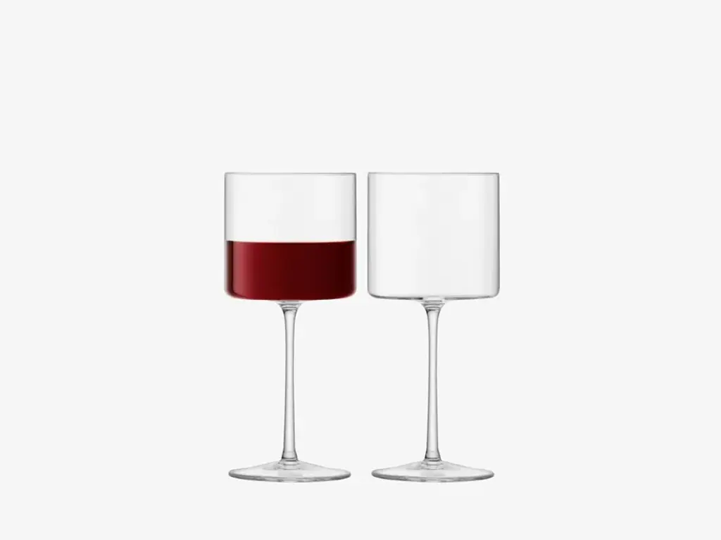 OTIS RED WINE GLASS is a set of two of mouth-blown wine glasses with cylindrical bowls and an angular, geometric profile.Mouth-blown glassCylindrical bowls with flat basesHand-drawn stemsOtis is a contemporary collection of mouth-blown drinkware. Cylindrical bowls with flat bases create angular, geometric shapes with a modern aesthetic.
