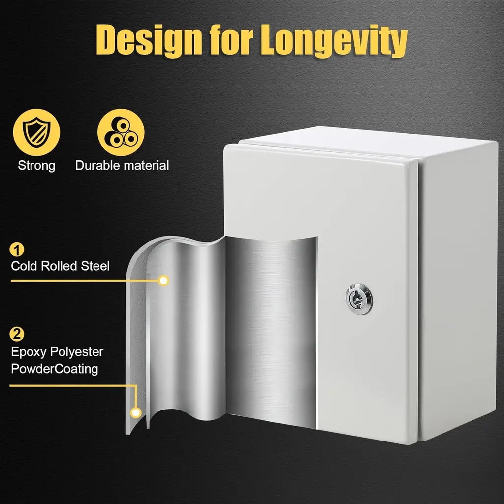 IP66 Rated Protection: Meeting 4X & IP66 standards, this outdoor electrical box provides excellent water and dust resistance. The durable spray coating enhances corrosion resistance, effectively blocking splashes, rain, dust, and UV rays. Perfect for both indoor and outdoor applications, it guarantees reliable performance in harsh weather conditions0.06inch cold rolled steel Material: Built from 0.06inch /1.5mm cold rolled steel with precision cutting and welding, this electrical enclosure offers superior durability. Its high hardness prevents deformation. Equipped with heavy-duty hinges and a waterproof lock, it’s designed to withstand impacts from both inside and outside, ensuring long-lasting protection for your equipmentSealed Against the Elements: The outdoor electrical box features premium rubber sealing strips that prevent rainwater intrusion, protecting internal components from . The thick seal performs exceptionally well in changing weather, ensuring the box remains tightly closed during heavy rains, windy storms, or snowy days, keeping dust and water out effectivelyEasy Installation: Say goodbye to complicated setups! This enclosure comes with all the necessary accessories and pre-drilled mounting holes for quick installation. With multiple access points and two sets of keys provided, you can customize the installation to your needs. The sturdy hinged cover is built to resist damage, ensuring easy access without sacrificing durabilityVersatile Applications: Perfect for a wide range of outdoor uses, this electrical box is suitable for industrial equipment and more. Whether in factories, construction sites, shopping malls, or residential areas, it offers reliable protection for your electrical components
