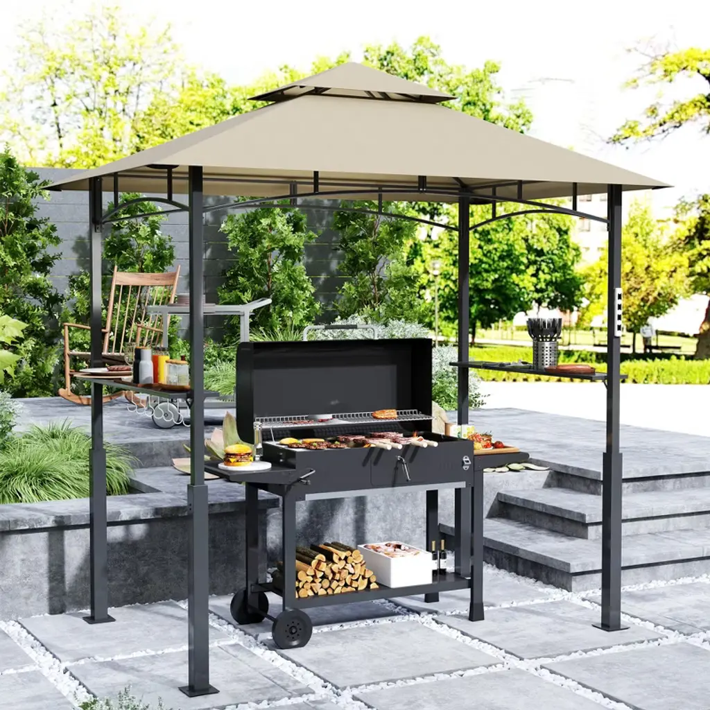 Outsunny 8' X 5' Grill Gazebo, Double Tiered Outdoor Bbq Gazebo With Led Light, 2 Side Shelves, Hooks And Bottle Opener For Patio Yard, Khaki
