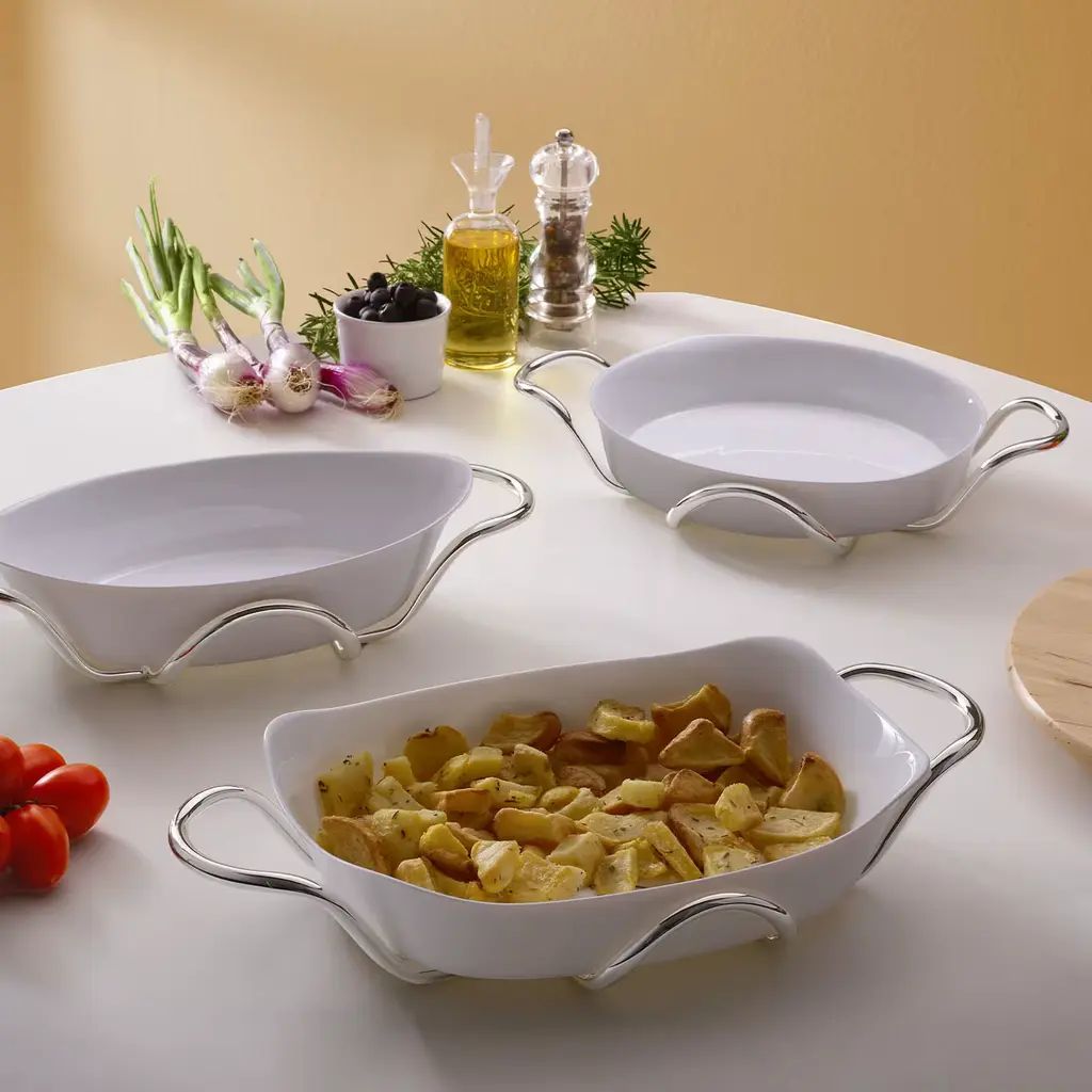 A refined solution for bringing food just taken out from the oven directly to the table, this fluid-lined brass holder plated in polished silver and incorporating practical handles comes together with a simple oval ceramic baking dish. An unmistakably contemporary flair marks the set, which is equally ideal for complementing domestic or hospitality contexts, alike.