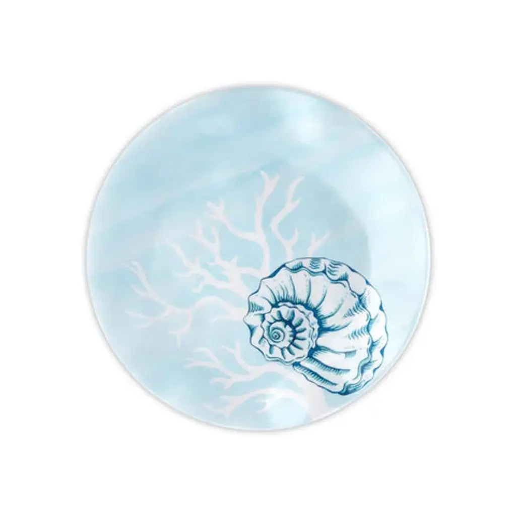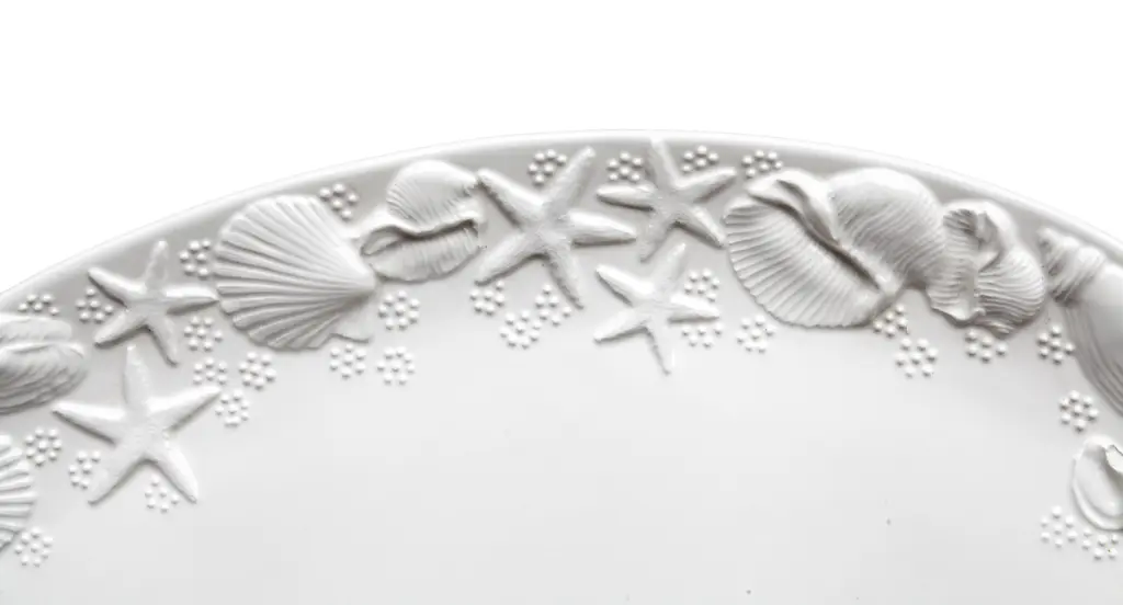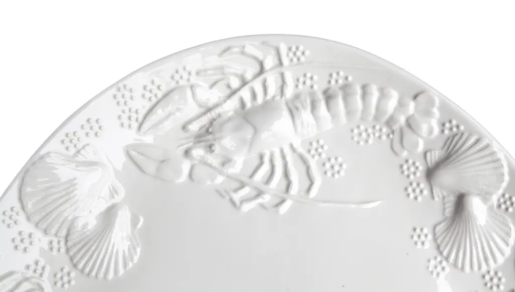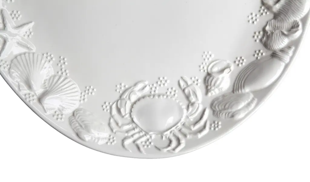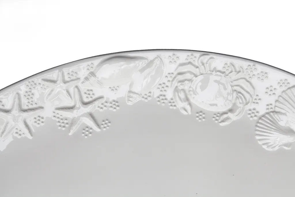 Large Italian ceramic serving platter featuring an embossed sea life motif. Glossy white finish. Small spot missing the glaze, barely visible.