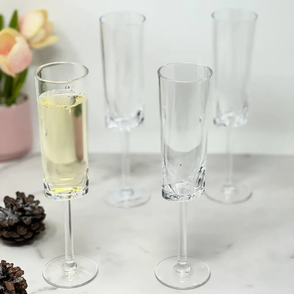 Serve your guests with BPA-free stunning plastic flutes which have style and durability. Get our unbreakable plastic champagne glasses and make a statement with these elegant and long-lasting party glasses.. This set includes four plastic champagne glasses, each holding a generous 12 ounces of your preferred champagne. These mimosa glasses are break resistant, meaning you don't have to worry about messy accidents or replacing broken glasses. Impress your guests and elevate your champagne tasting experience with these clear plastic champagne flutes.. Raise a toast with confidence using our wedding champagne flutes made with the highest quality, BPA-free plastic material that is not only incredibly sturdy, but also crystal clear in appearance. So go ahead, clink your glasses in harmony and celebrate with our top-quality, durable wedding glasses.. No need to worry about the tedious task of hand-washing after drinking hour. Simply toss them in your top rack dishwasher and they will come out sparkling like new every time. This convenience makes our dishwasher safe flutes perfect for both everyday use and entertaining.. Whether you're hosting a pool party, or just enjoying a warm summer evening on the patio, these shatterproof flutes are sure to become your go-to choice for drinking your favorite wine. So, get your flutes today and elevate your entertaining game to the next level!. Inside and Outside Friendly. Crystal Clear looks similar to glass