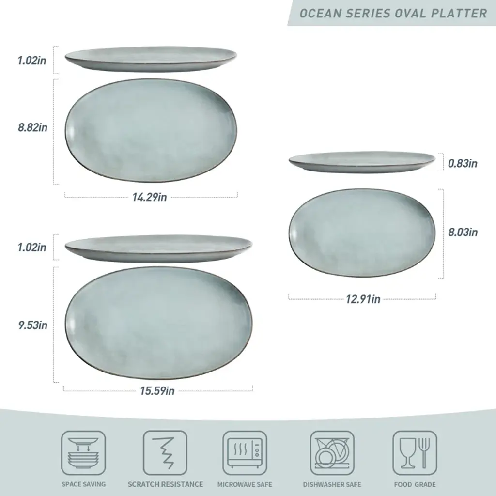 This serving Platter set is the ultimate combination of style, functionality, and versatility. This serving dishes is made of 100% lead-free glaze and no need to worry about harmful substances leaching into your food. Bright and dreamy colors enhance the luxury of this sturdy stoneware tableware to feast your guests' eyes and set the tone for a pleasant meal. Each dish is made of high-quality stoneware that is dishwasher and microwave-safe. The dish set is easy to clean and easy to care for. These serving trays can hold anything you like, including turkey, pasta, fish,steak,dessert and more.