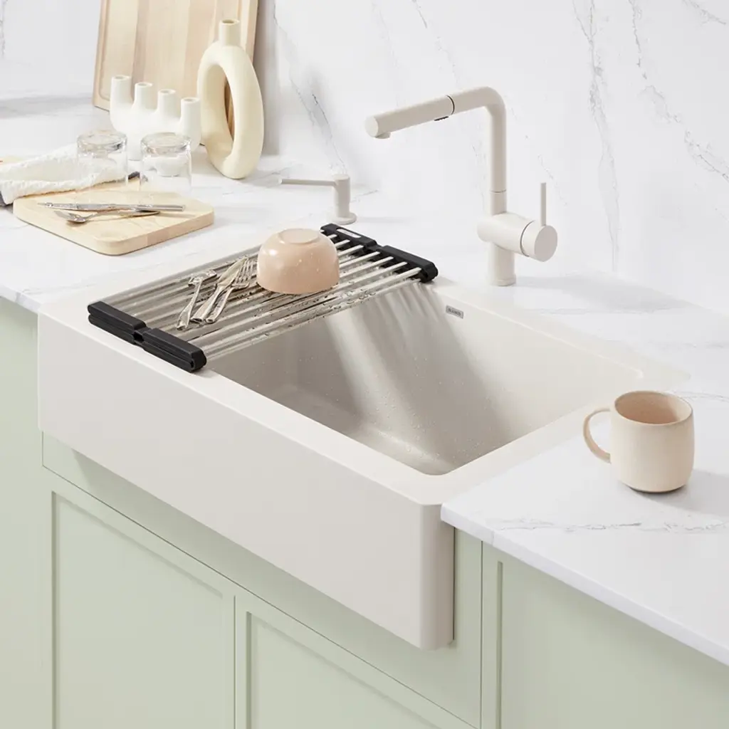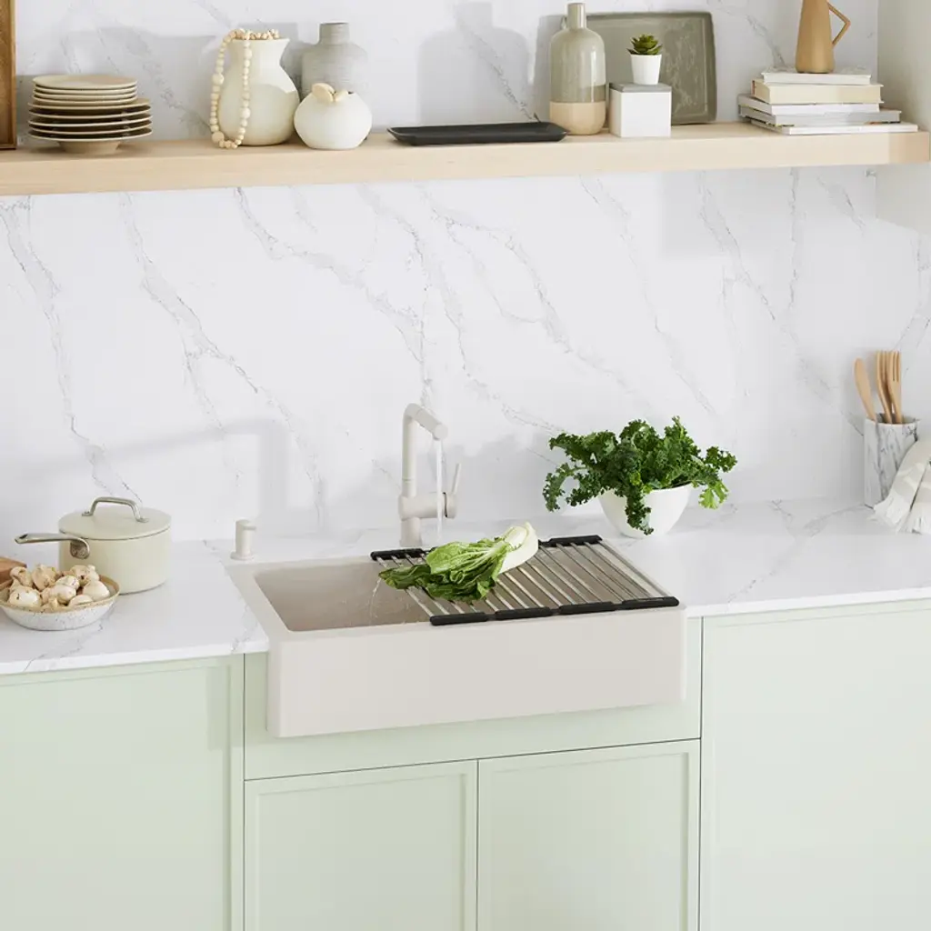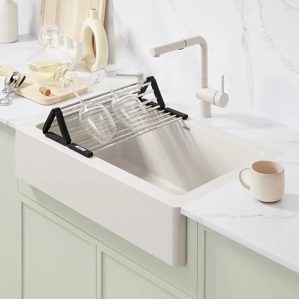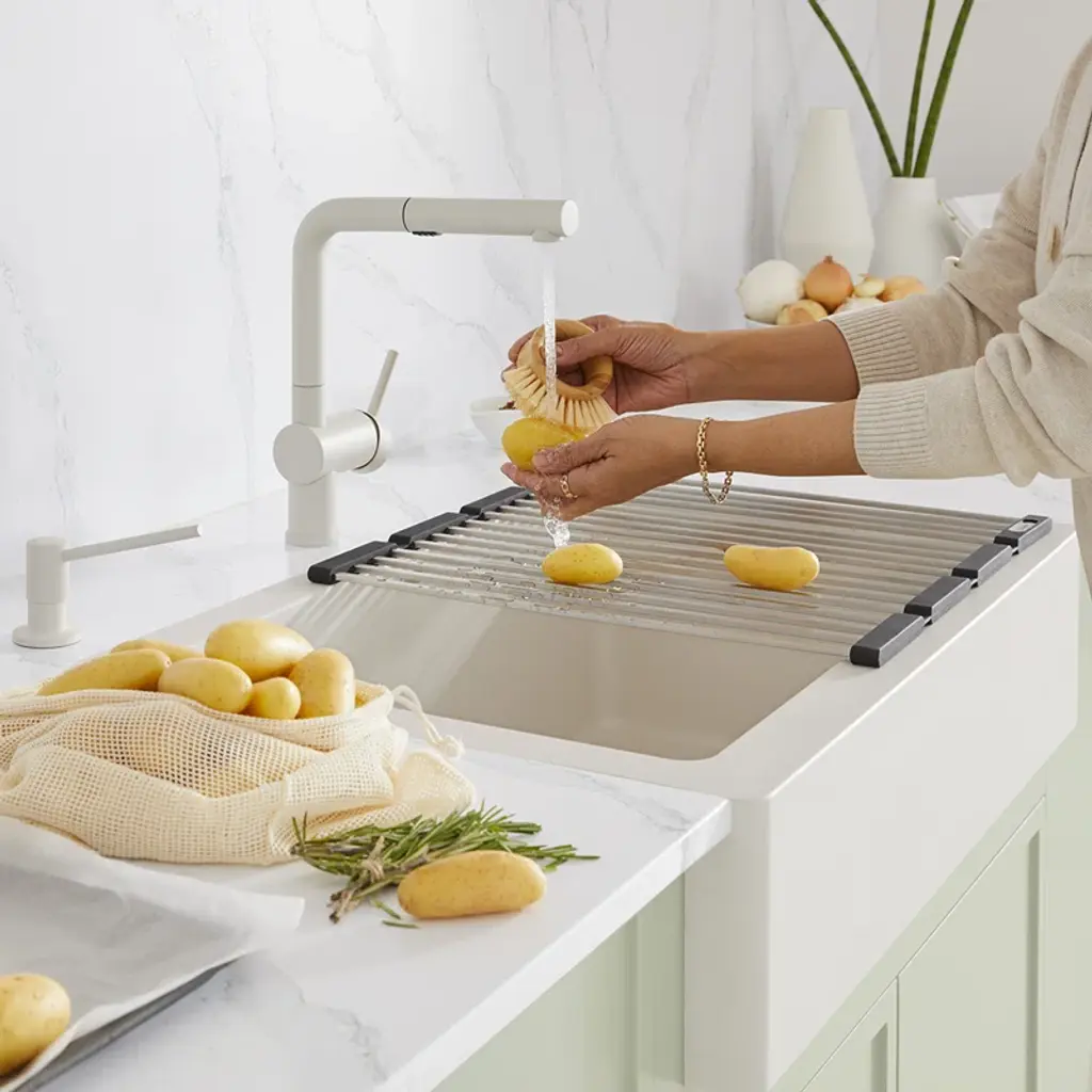 An essential for any kitchen, especially when space is at a premium, the All-Clad Dish Drying Mat is a safe landing pad for wet dishes, glassware, and oversized pots and pans to ensure they remain free of chips and scratches. This durable oversized mat measures 16 in. x 28 in. (40 cm by 71 cm) and is designed with a super-absorbent thick foam that keeps counters dry while polyester mesh prevents condensation and fog build-up inside of glasses. All-Clad Dish Drying Mats offer several folding options that allow for convenient storage and are available in a variety of stylish colours to compliment your taste. Machine wash for easy care.